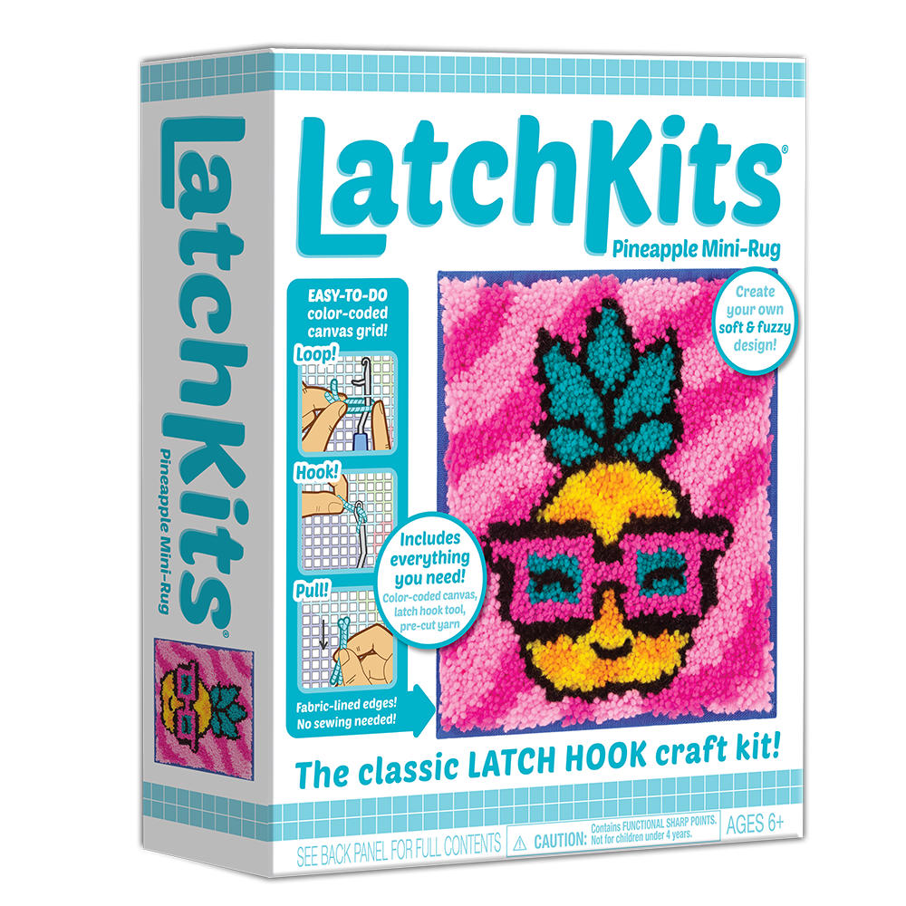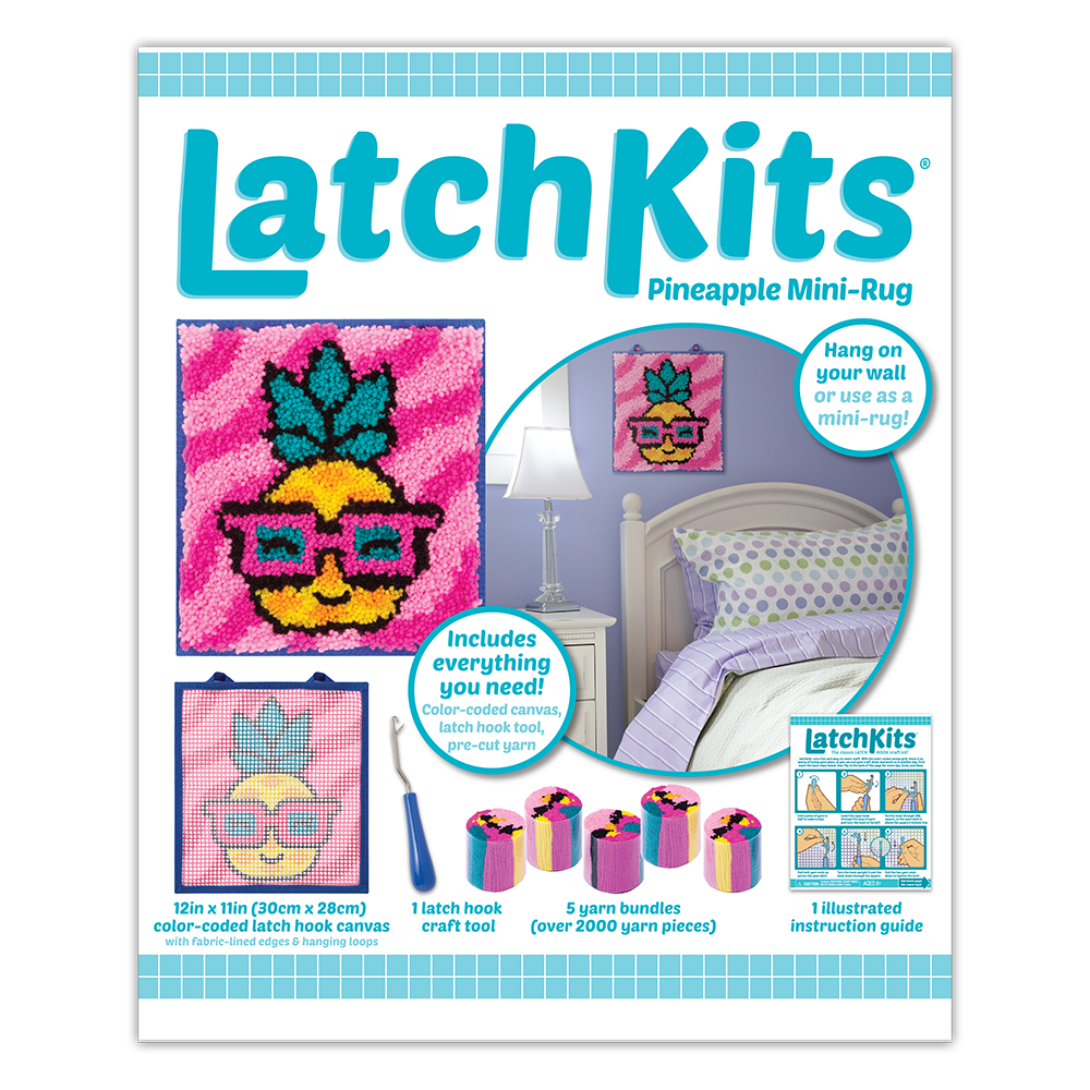 The classic latch hook craft kit is back! LatchKits are a fun and easy-to-learn craft—just loop, hook, and pull! Everything you need is included: the handy latch hook tool, pre-cut yarn and color-coded, easy-to-follow canvas make getting started on your project a snap. The sturdy canvas features fabric-lined edges and hanging loops to create your very own soft and fuzzy design that’s ready to hang on your wall or use as a mini-rug—it’s a great anytime project!