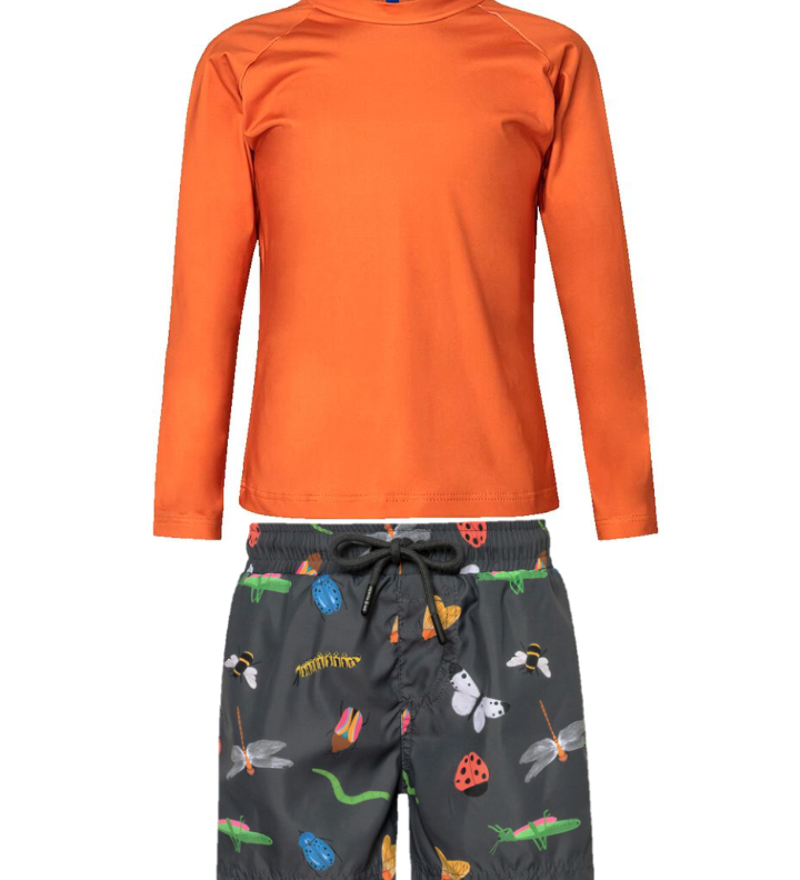 Pepita & Me Orange Rashguard & Insectos Gris Swimshort Set
