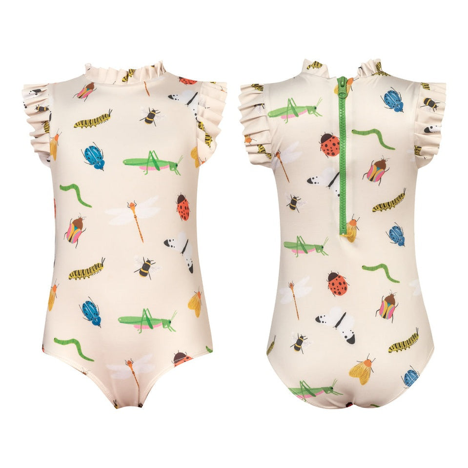 elegance and for how stunning it looks when worn. With short sleeve and neck ruffles and back zipper. This swimsuit is an absolute gem! Made in Colombia