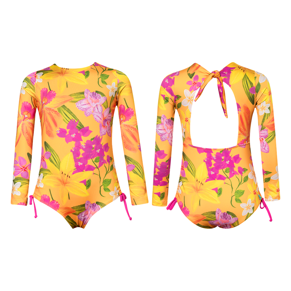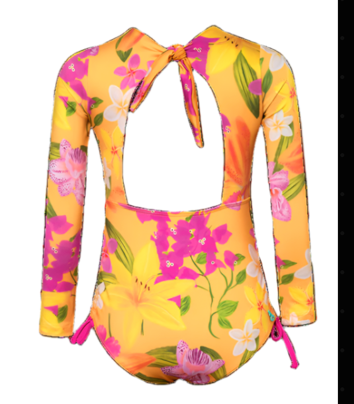 One-piece swimsuit with long sleeves for sun protection with side gathers. The fabric has the highest ultraviolet protection factor, UPF50+ wich means the fabric creates a barrier against the sun´s UV rays. Made in Colombia