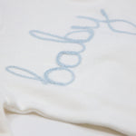 This cream two-piece set features the word "baby" written on the front of our super cozy cotton tee in sky blue yarn. With matching cream pants, this outfit is perfect for any baby! Available in infant sizes. Designed in Minnesota.