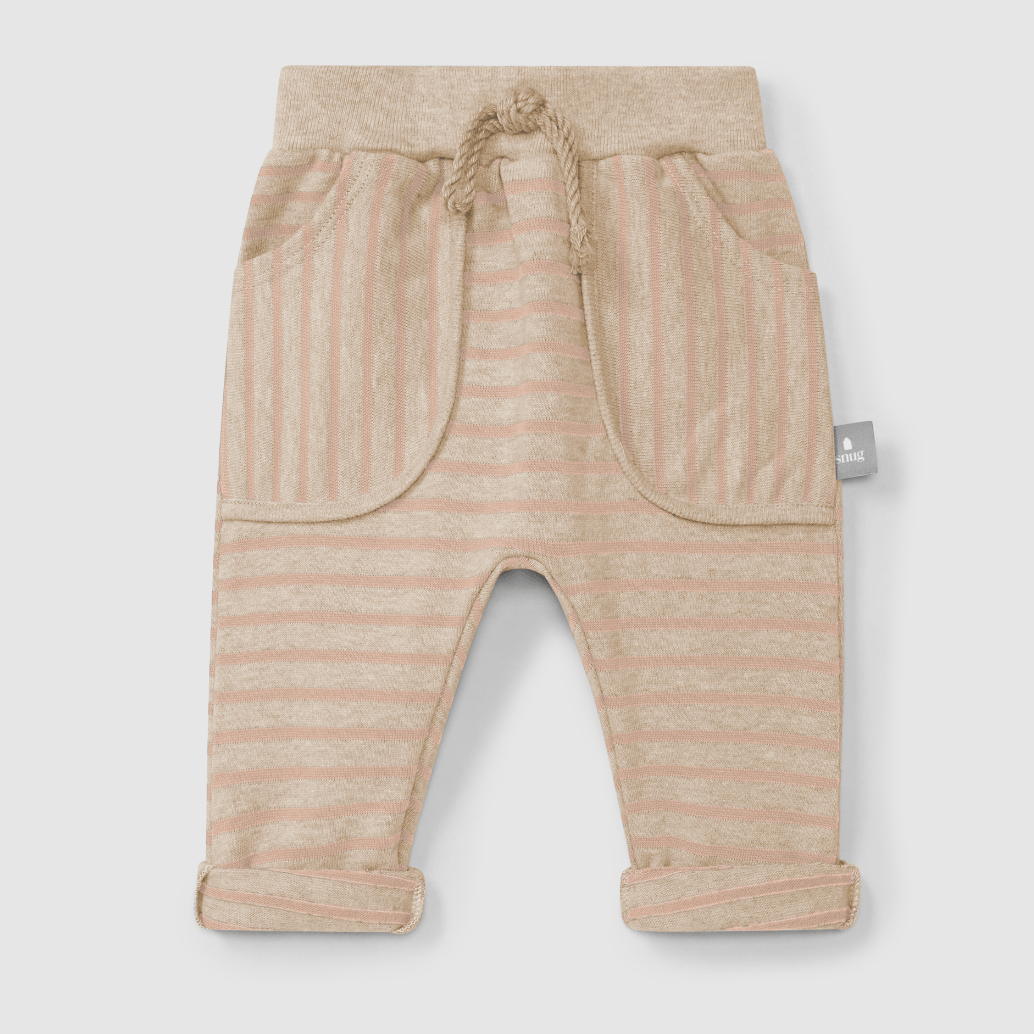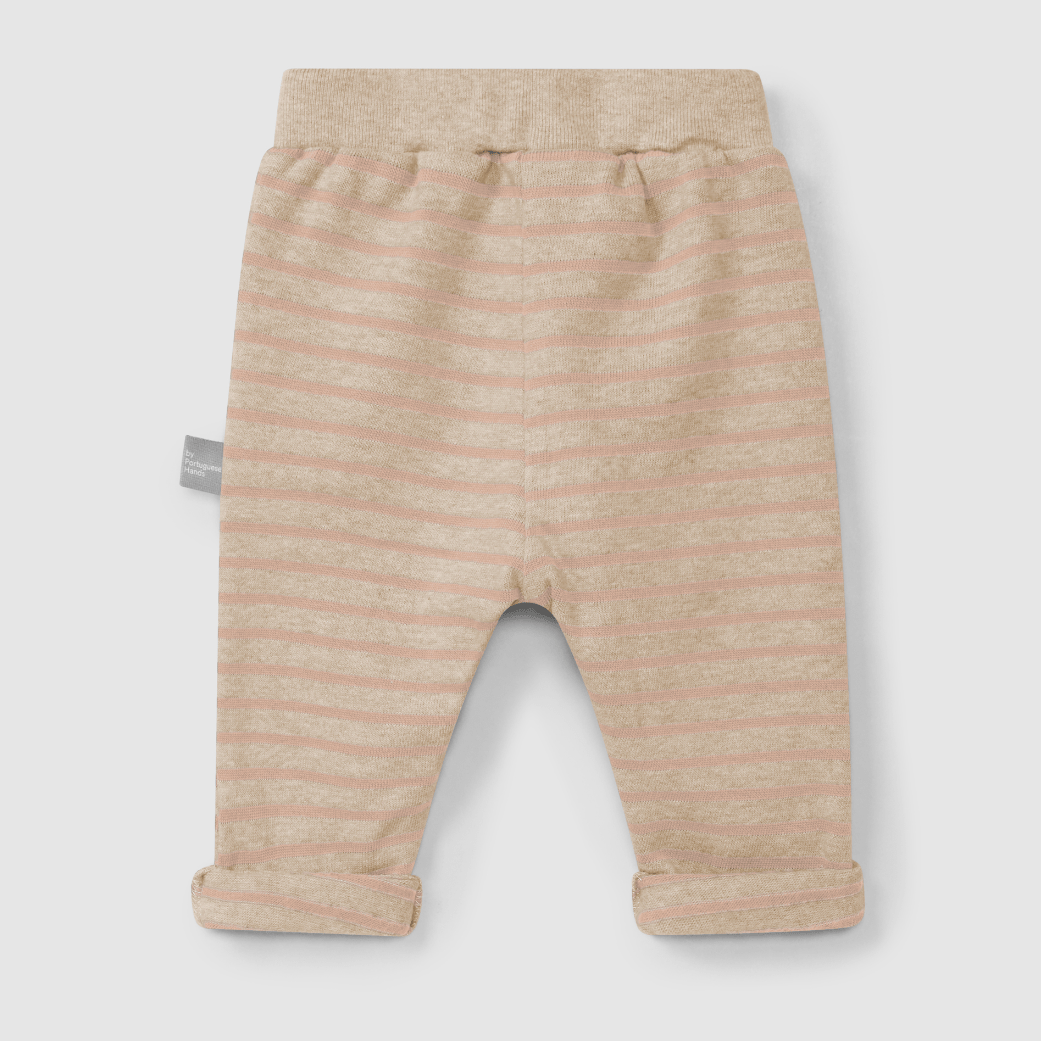 Striped print pull-up pants in 100% soft brushed cotton jersey. Functional pockets at the front and decorative drawstring at the waist. Cuff can be used rolled up or rolled down for greater durability.