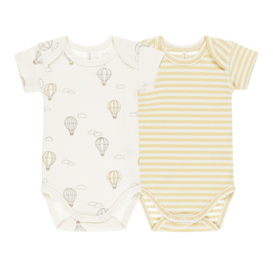 Take to the sky with these playful Quincy Mae Short Sleeved Bodysuits (2pk) featuring hot air balloons and another with beautiful yellow stripes!