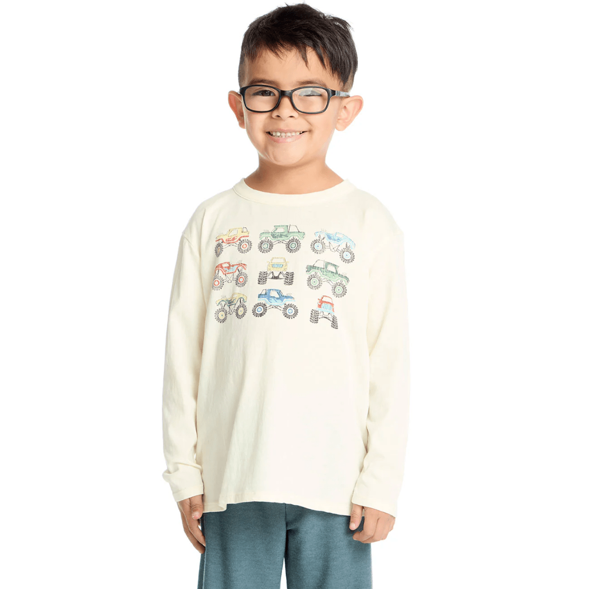 Rainbow trucks hit the road in the Monster Truck Rally Long Sleeve, perfect for showing off his love for all things automotive.