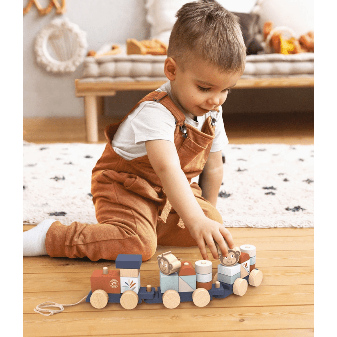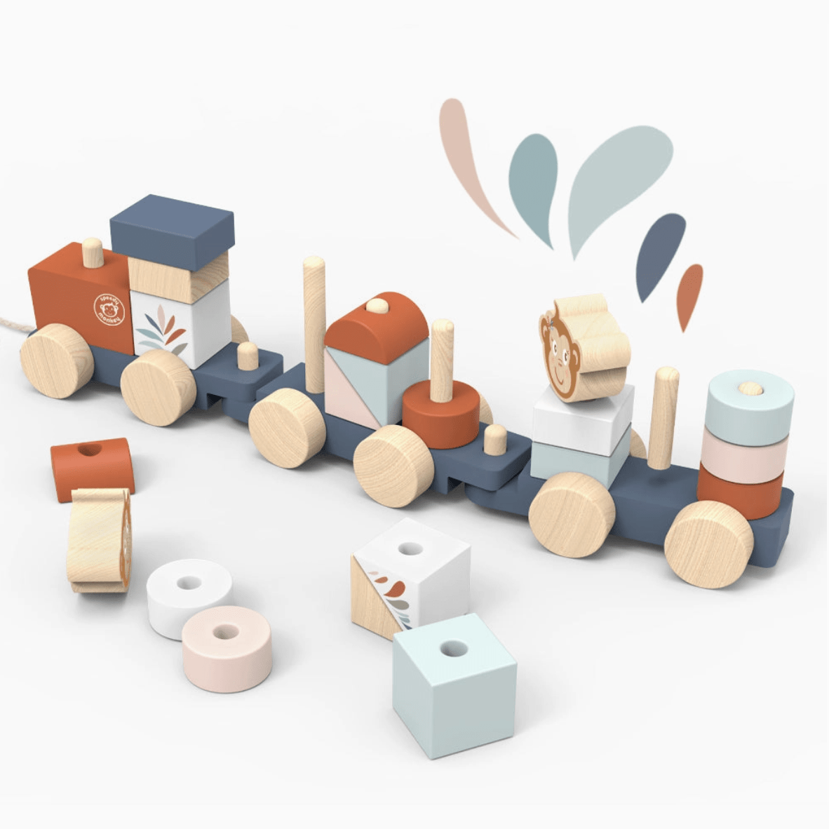 A fun wooden pull-along train stacker, painted in trending soft colors and featuring our favorite character, the monkey. Your little one will have hours of fun, stacking elements on the train and building houses with colorful blocks. Once everyone on board, tchu tchu off goes the train for a new adventure! This toy is crafted from sustainably sourced wood from FSC® certified forests. Presented in a beautiful gift box. Specifications Color: multicolor Recommended Age: 12+ months Material: wood