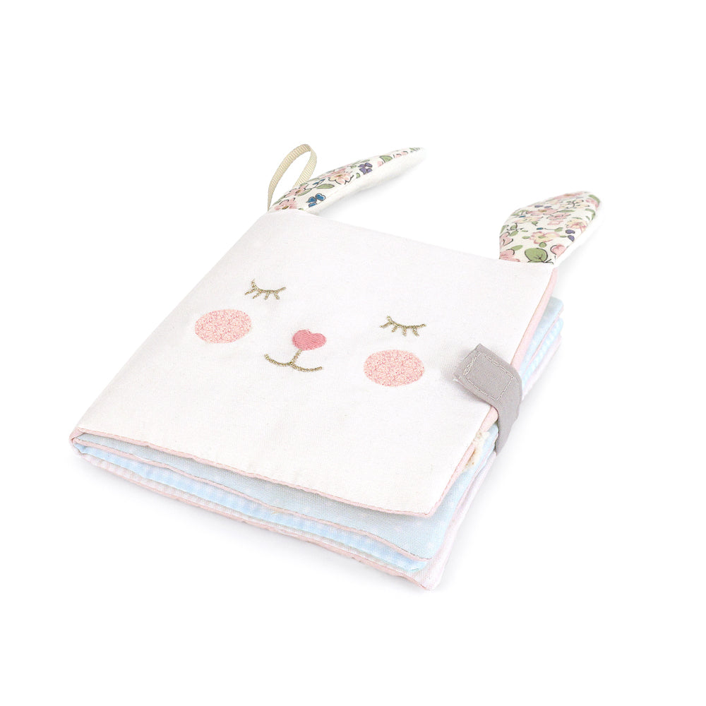 Mon Ami's Bunny and Friends Soft Fabric Book takes little adventurers on a charming sensory journey! Each page reveals crinkly textures that add extra fun to playtime. Featuring cute rainbows, fluttering butterflies, friendly frogs, and blooming flowers, this spring-themed book bursts with joy. The soft 3D bunny ears lined with flowers bring a delightful touch, while the convenient velcro closure makes it easy to carry anywhere. With four double-sided, softly colored pages full of sensory delights, this enchanting book introduces babies to the magic of spring in a playful and engaging way.