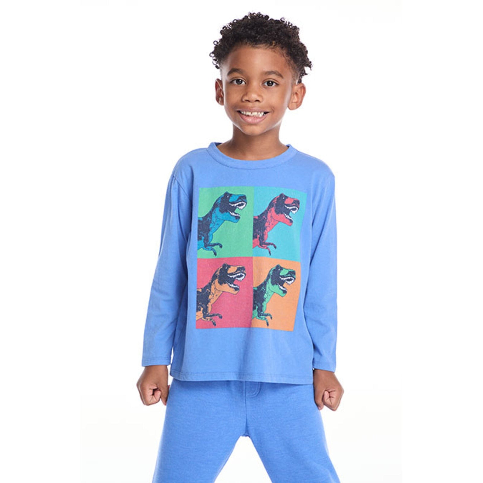 Prepare for a wild ride with our T-Rex Boys Long Sleeve shirt! This top boasts a vibrant Warhol-inspired print, adding a splash of fun to any ensemble. The soft blue dream fabric ensures both comfort and style.