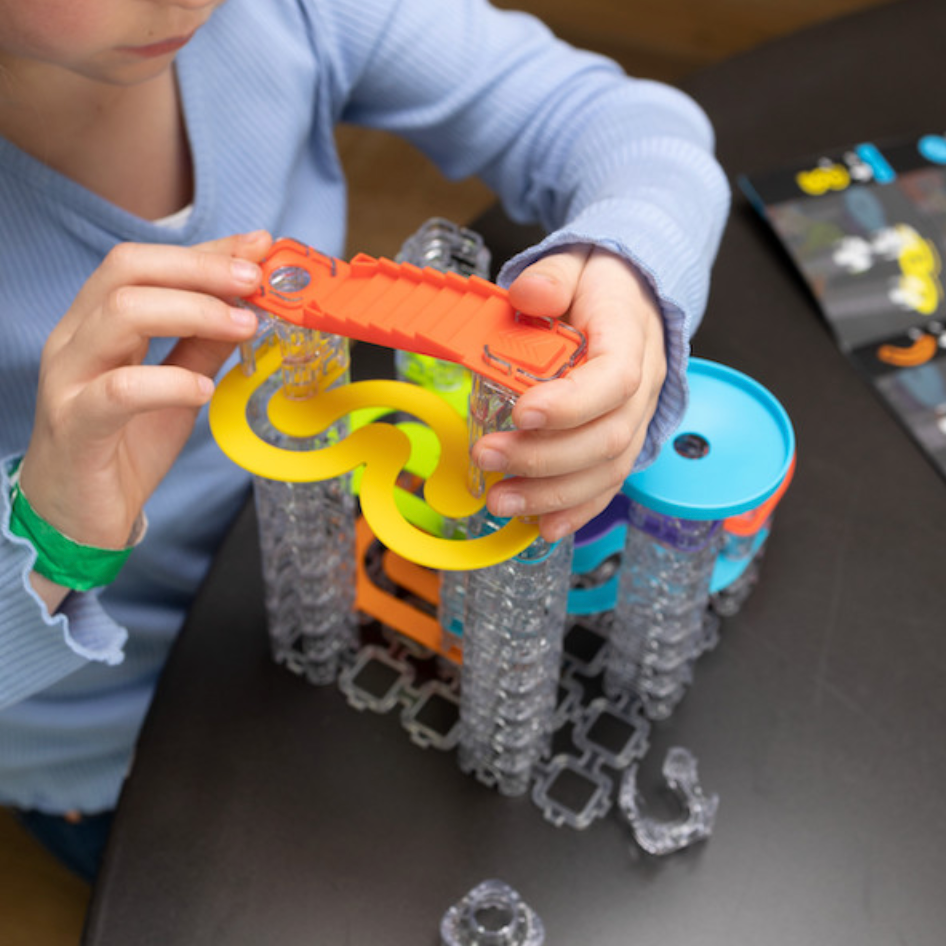 Experience the magic of marbles rolling on invisible slopes with the Fat Brain Trestle Tracks Builder Set! This 73-piece set includes stacking cubes, flat tracks, and stainless steel marbles that glide smoothly along widening paths. Build guided designs or create your own exciting marble runs. It’s a fun way to boost creativity, problem-solving, and engineering skills. Durable and compatible with other sets, it’s perfect for endless play and discovery! Ages 8+