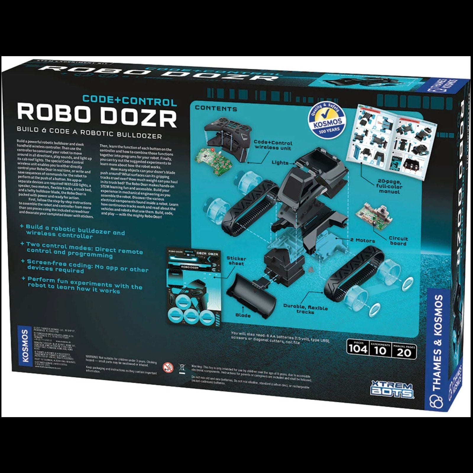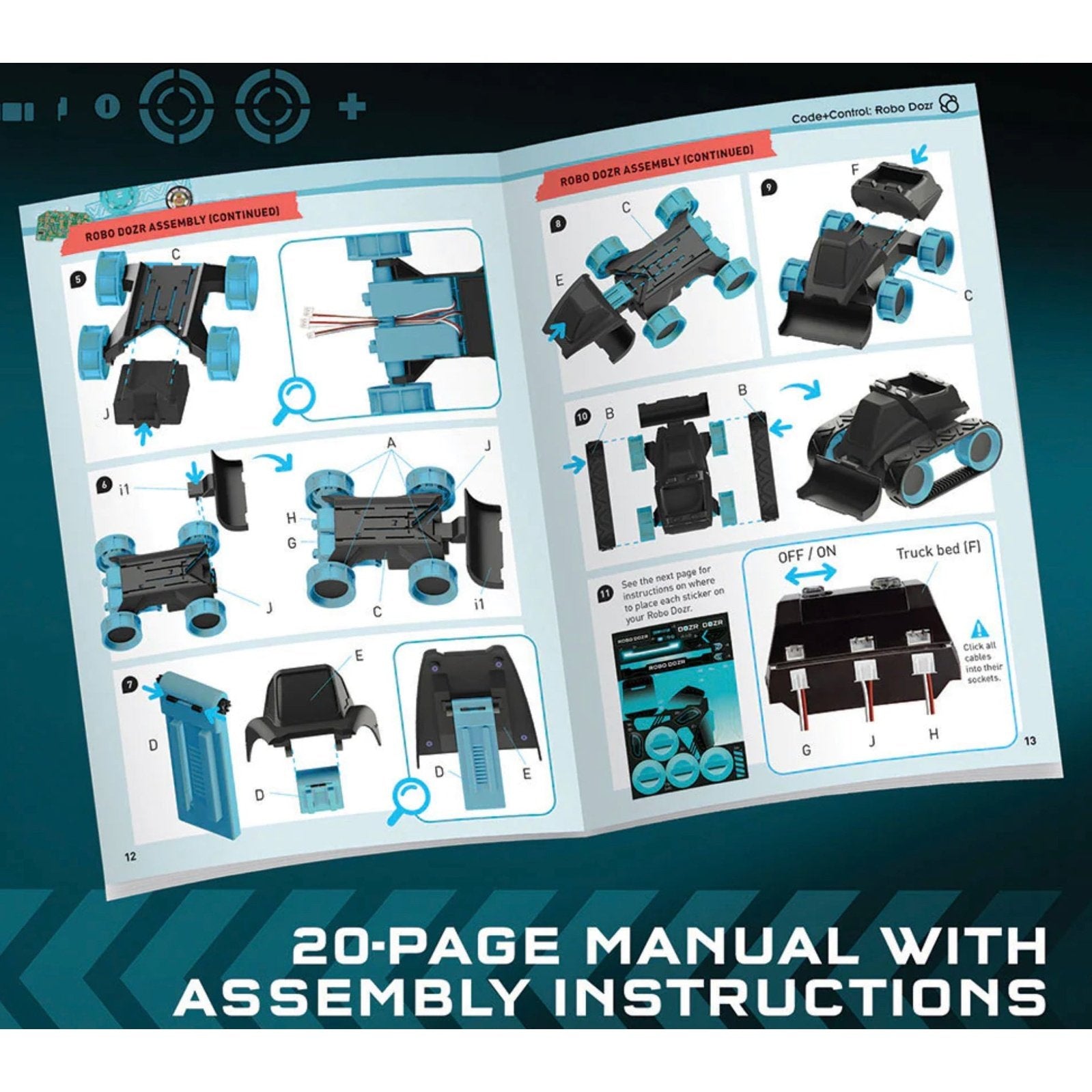 Build a powerful robotic bulldozer and sleek handheld wireless controller. Then use the controller to command your robot to move around in all directions, play sounds, and light up its cab roof lights. The special Code+Control wireless unit enables you to either directly control your Robo Dozr in real time, or write and save sequences of commands for the robot to perform at the push of a button. No app or separate devices are required! With LED lights, a speaker, two motors, flexible tracks, a truck bed, and a hefty bulldozer blade, the Robo Dozr is packed with power and ready for action.