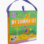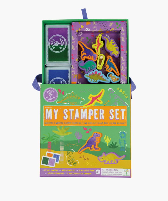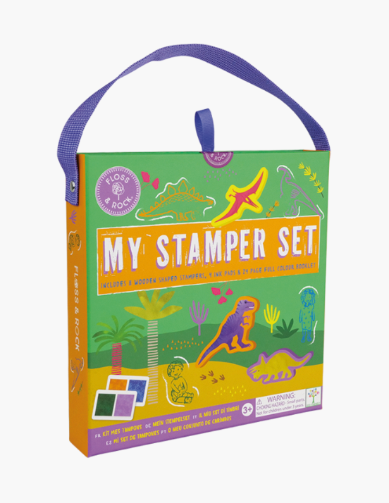 Unleash your imagination with the Floss & Rock My Stamper Set! This portable kit includes 8 dinosaur-themed wooden stamps, 4 bright ink pads, and a 24-page colorful activity book packed with fun scenes. Everything tucks neatly into a reusable carry case with a pull-out drawer and handle, perfect for creative play anywhere. Dive into the booklet, stamp vibrant images, and create your own exciting stories! Eco-friendly and ideal for kids aged 3 and up.