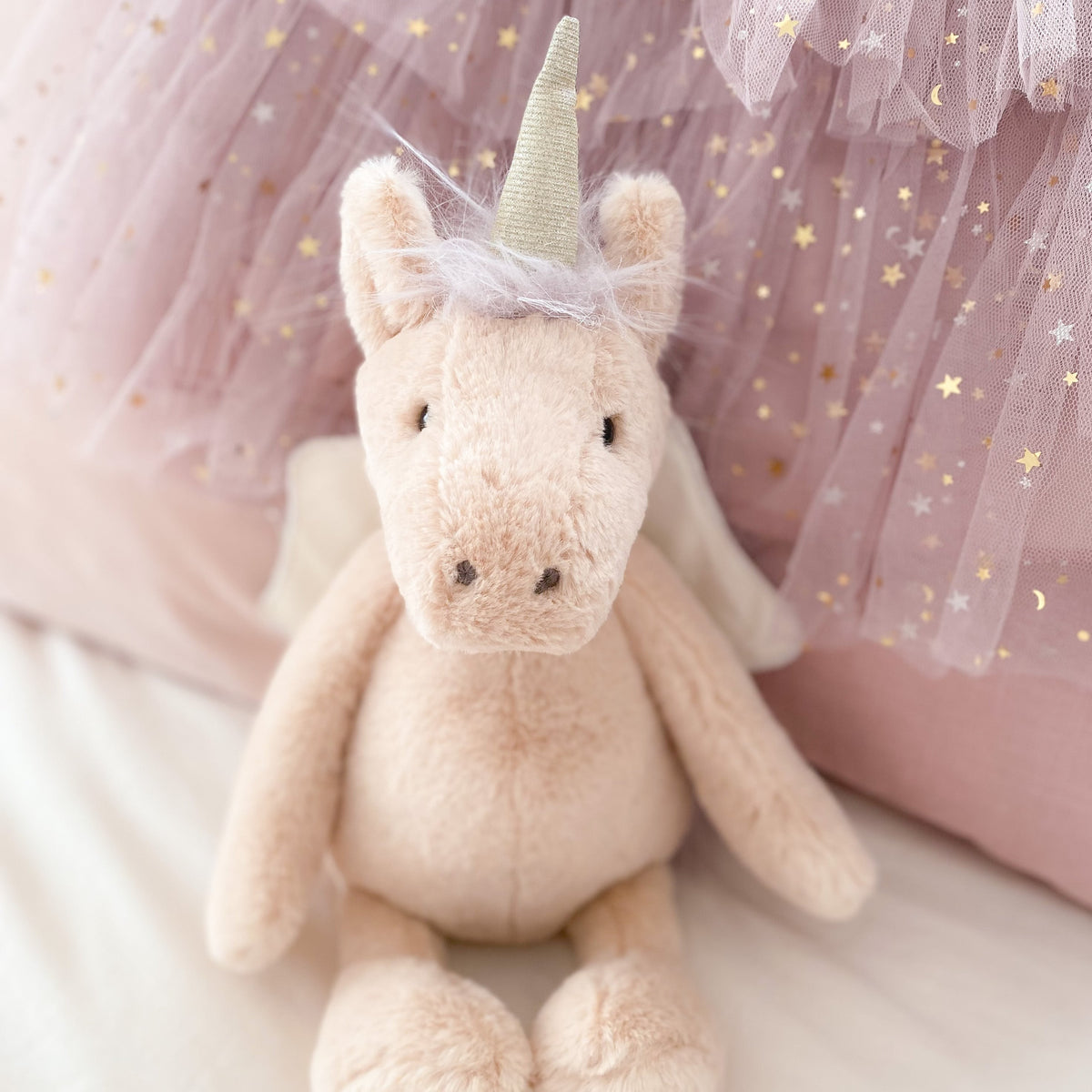 There isn't a more magical creature than Luna the Unicorn plush toy. Part fairy, part unicorn, this stuffed animal brings endless imagination to the nursery with her blush pink fur, cream-colored wings, and glittery gold horn. Supersoft and snuggle-ready, Mon Ami's unicorn plush toy is the perfect gift for newborns or toddlers. Just rub the horn of our whimsical unicorn stuffed animal and watch the magic unfold.