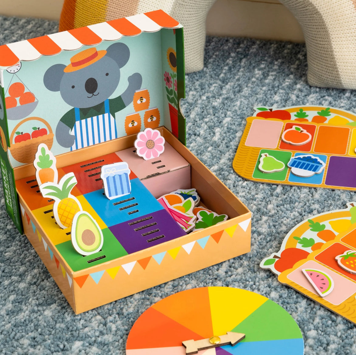 Market Match-up combines a memory game with a market theme. Spin the spinner to determine which color produce you need to find from the face-down pieces. You can turn over only one piece to see if it matches. If not, you place it back down but try to remember where it is for matching later in the game. You need a good memory and some luck with the spinner to win! A fun sorting element comes in at the end of the game, where kids can set up their market stall with everything in the correct order to gain extra points.