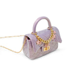 Sparkle and shine with the Zomi Gems Classic Sparkle Top Handle Handbag in Baby Purple. This fabulous structured bag features a glittery quilted finish, a shimmering wrapped handle, and a gold turn-lock closure that screams timeless elegance. The real showstopper? A detachable gold chain strap adorned with adorable pink enamel flower charms—perfect for adding extra pizzazz to any look. Wear it as a chic handheld or swing it crossbody for versatile style. Ideal for dress-up occasions, parties, or whenever your little fashionista wants to turn heads. Dimensions: 6.5" x 4" x 3". Weight: 9 oz.