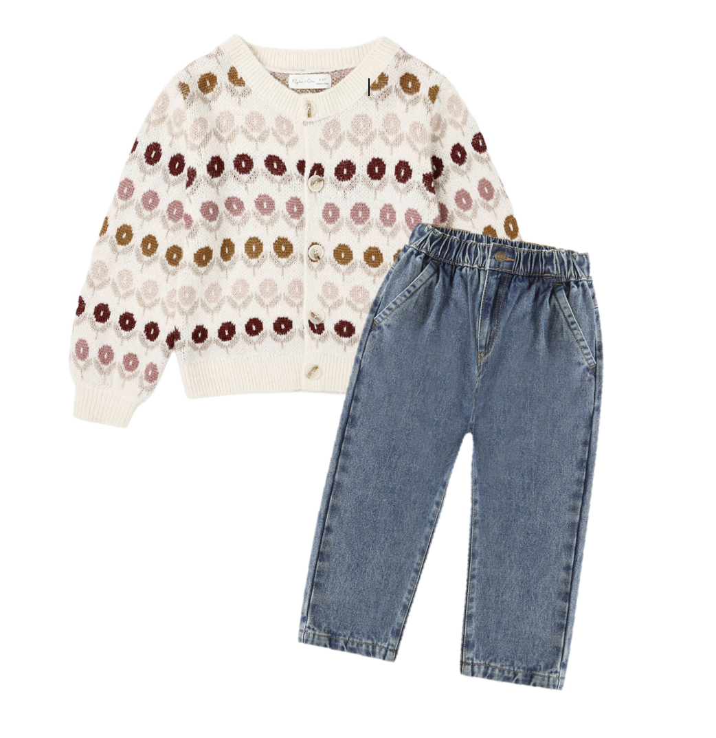 Rylee & Cru Cheyenne Cardigan (Floral Jacquard)/Jean (Indigo Denim) Set