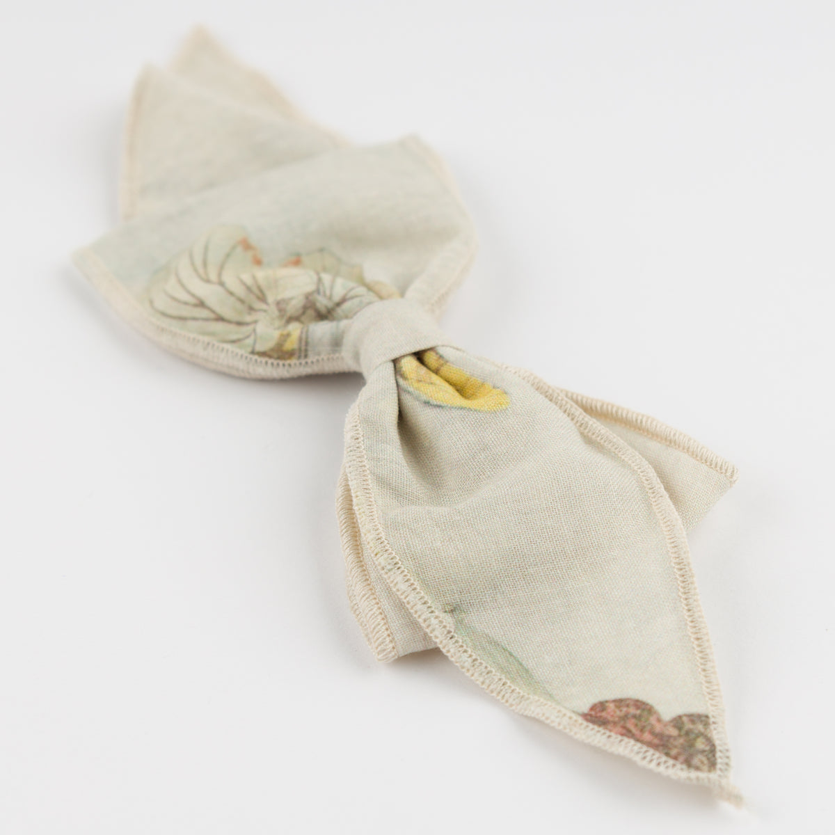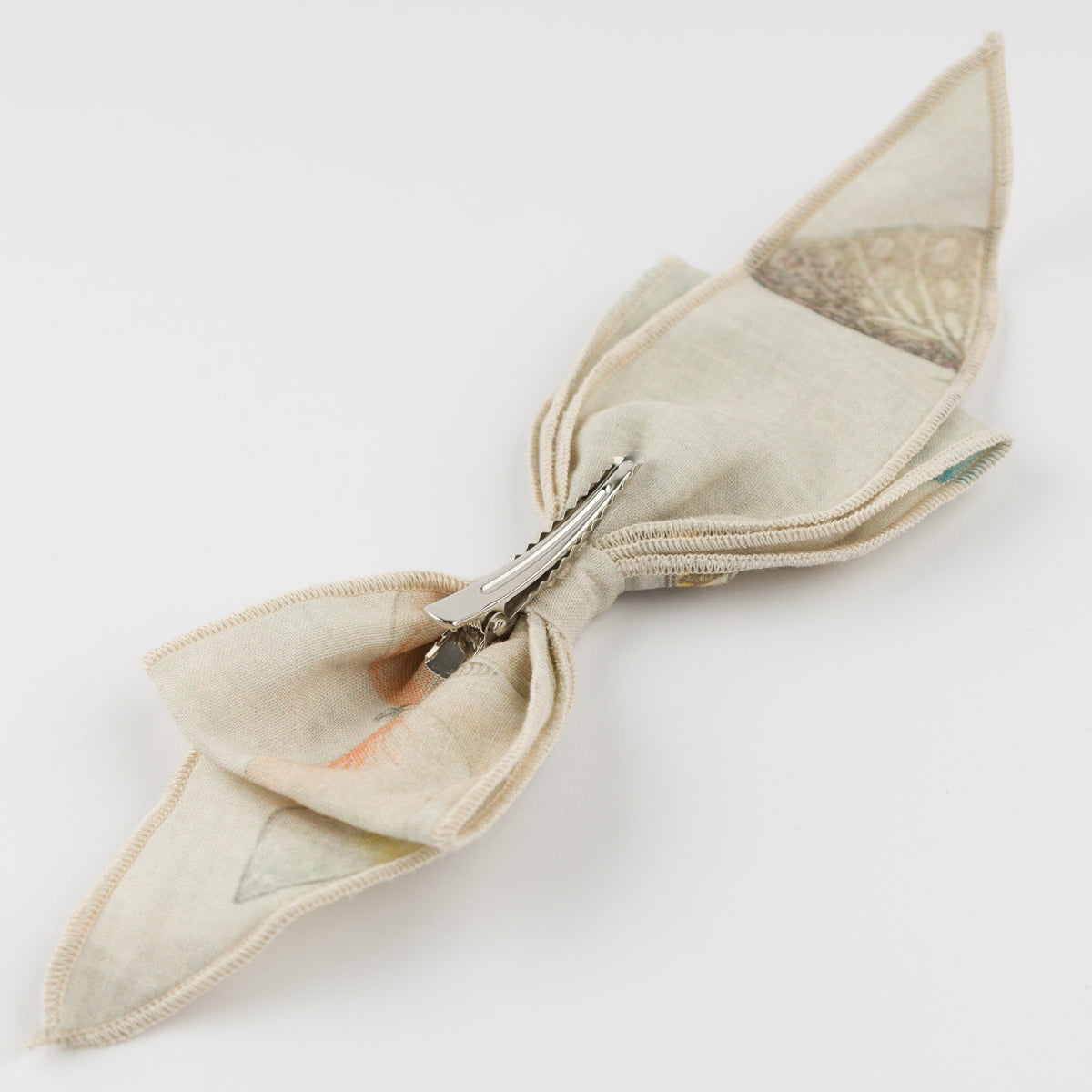 This bow is perfect for girls with its playful butterfly print on a natural color. Flutter around confidently with the secure fit of the alligator clip. Designed in Minnesota, this bow features a fabric blend of 55% linen and 45% lyocell. (Butterflylicious!)