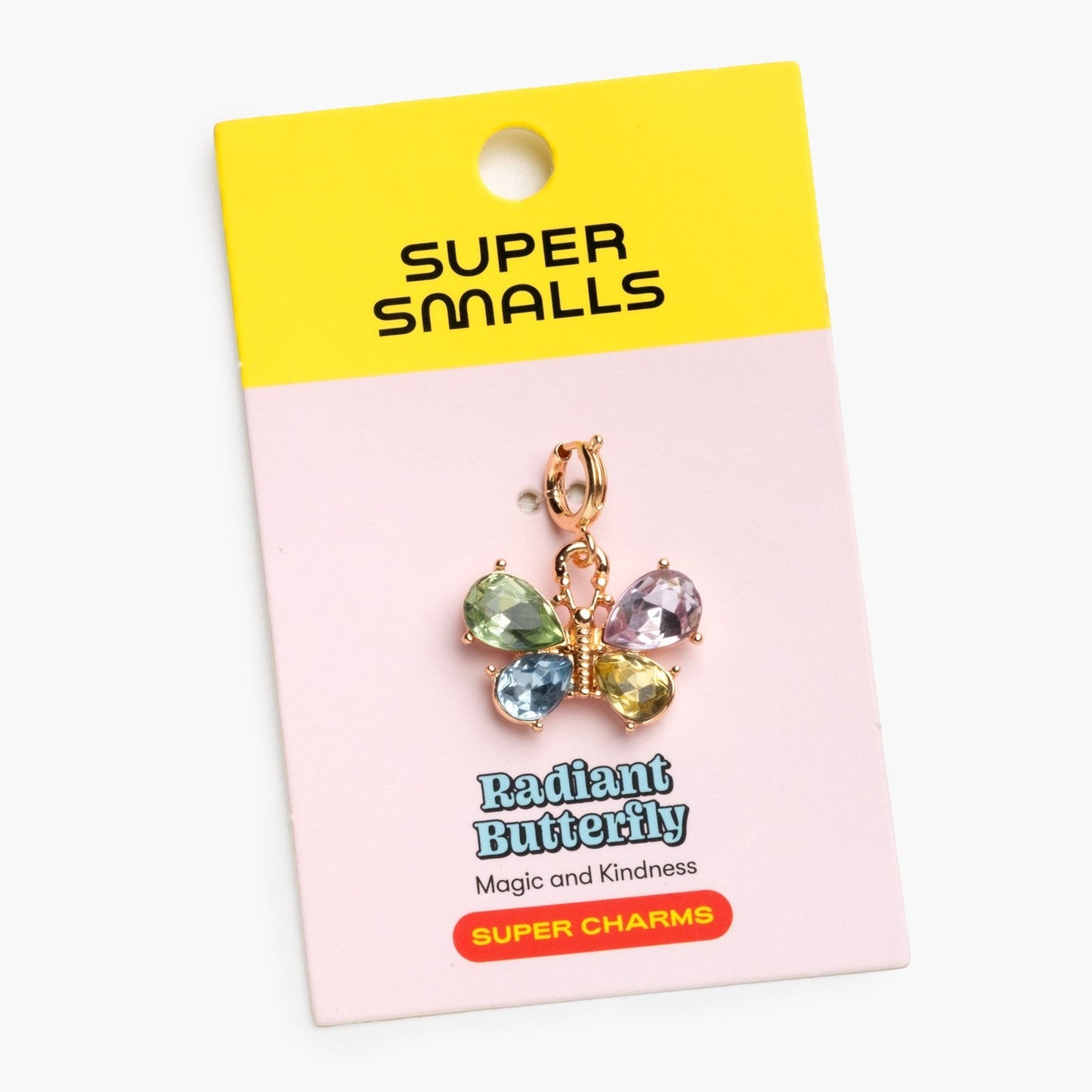 The Radiant Butterfly Super Charm is your wearable reminder that small things can make a big impact. With sparkling gem wings in pastel hues and golden details that glow, this charm brings a flutter of kindness to every accessory. With its easy-to-use clasp, you can clip it onto your Super Smalls charm bracelet, necklace, or wherever you need a little extra shine!