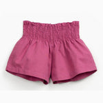 This t-shirt is constructed from organic cotton jersey in Shapes color. It boasts a slightly relaxed fit with short sleeves, a playful strawberry print, cute bow details, and a gathered hem for added charm. Features coconut buttons. These shorts are crafted from a blend of linen and organic cotton in the Stories shade. They sport a short length with an elasticized gathered waistband, a flowing silhouette, and coconut buttons for an extra touch of whimsy.