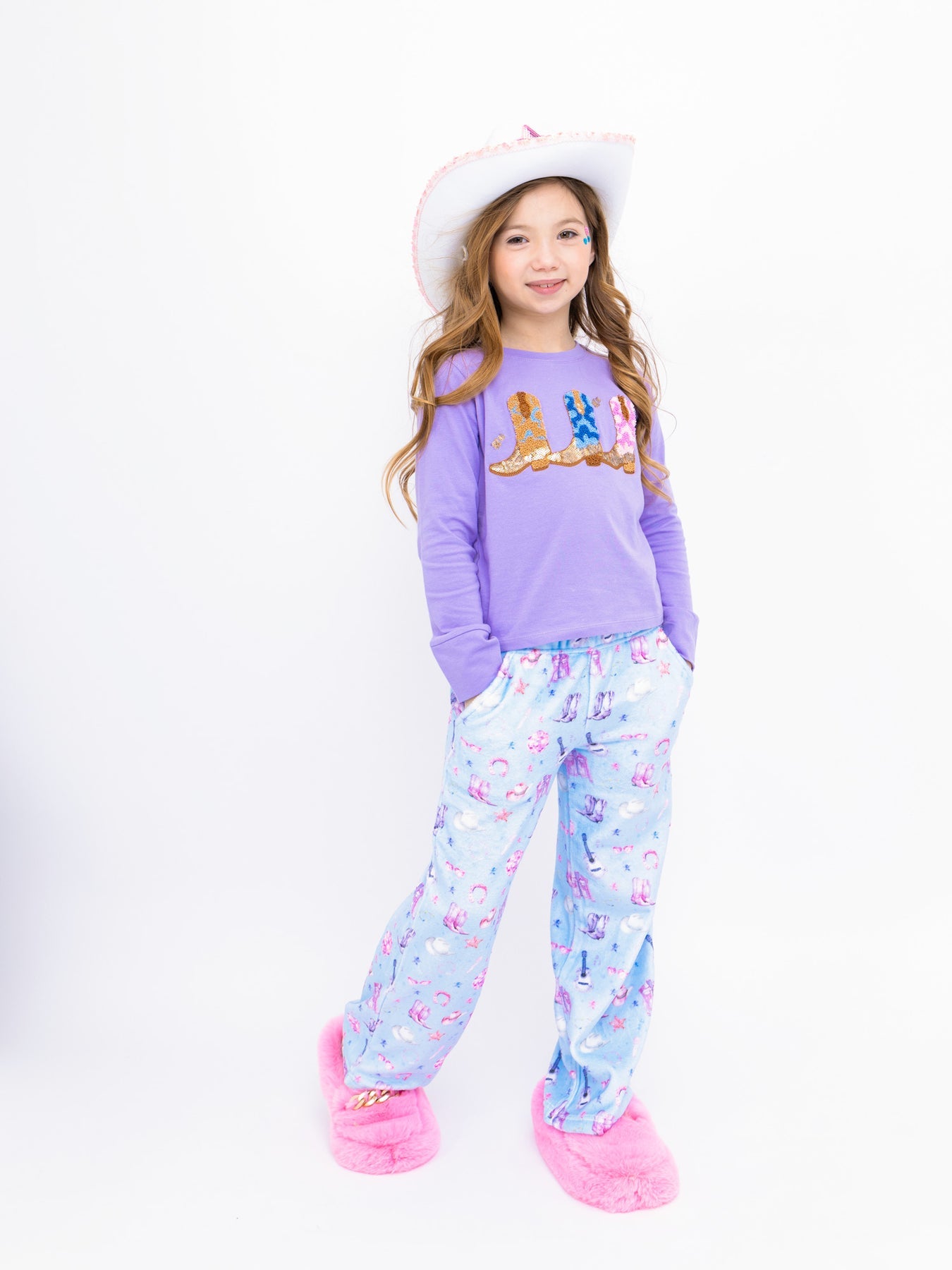 This playful lavender girl's long sleeve top features sparkling sequin and applique cowboy boots, making it a fun rodeo-inspired choice for girls sizes 4-16. Crafted from our ultra-soft 100% GOTS-certified organic cotton knit, it’s cozy enough for any season. An ideal layering piece girls top that adds a touch of western charm to her wardrobe.