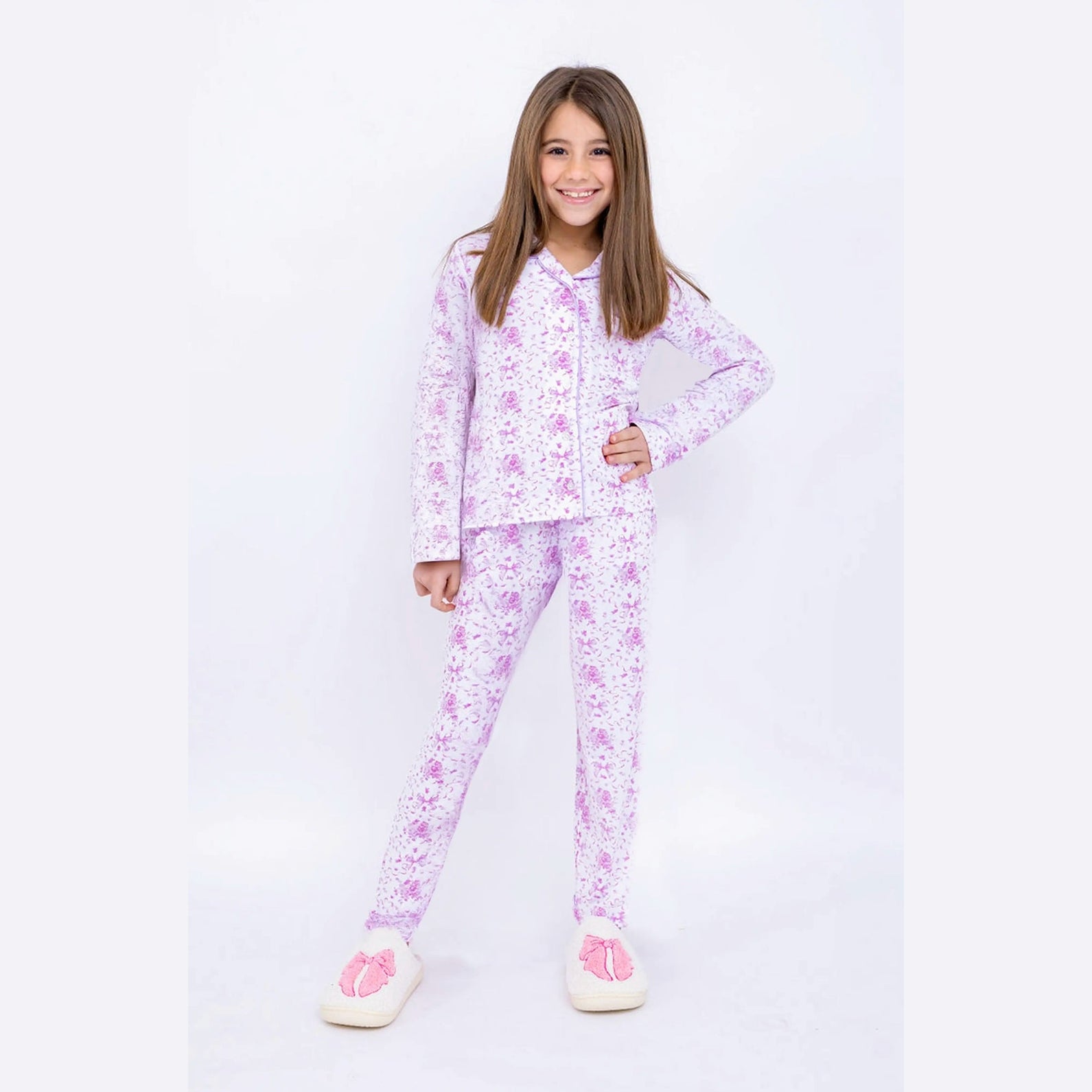 Refresh your tween’s pajama drawer with our Purple Bows and Floral Printed Long Sleeve Pajama Set. Crafted from super soft fabric, this cozy girls long sleeve top and bottom set is ideal for snuggling up or relaxing around the house. Featuring a button-up top and comfy pants with an elastic waistband, it’s easy to wear and designed for a laid-back fit.