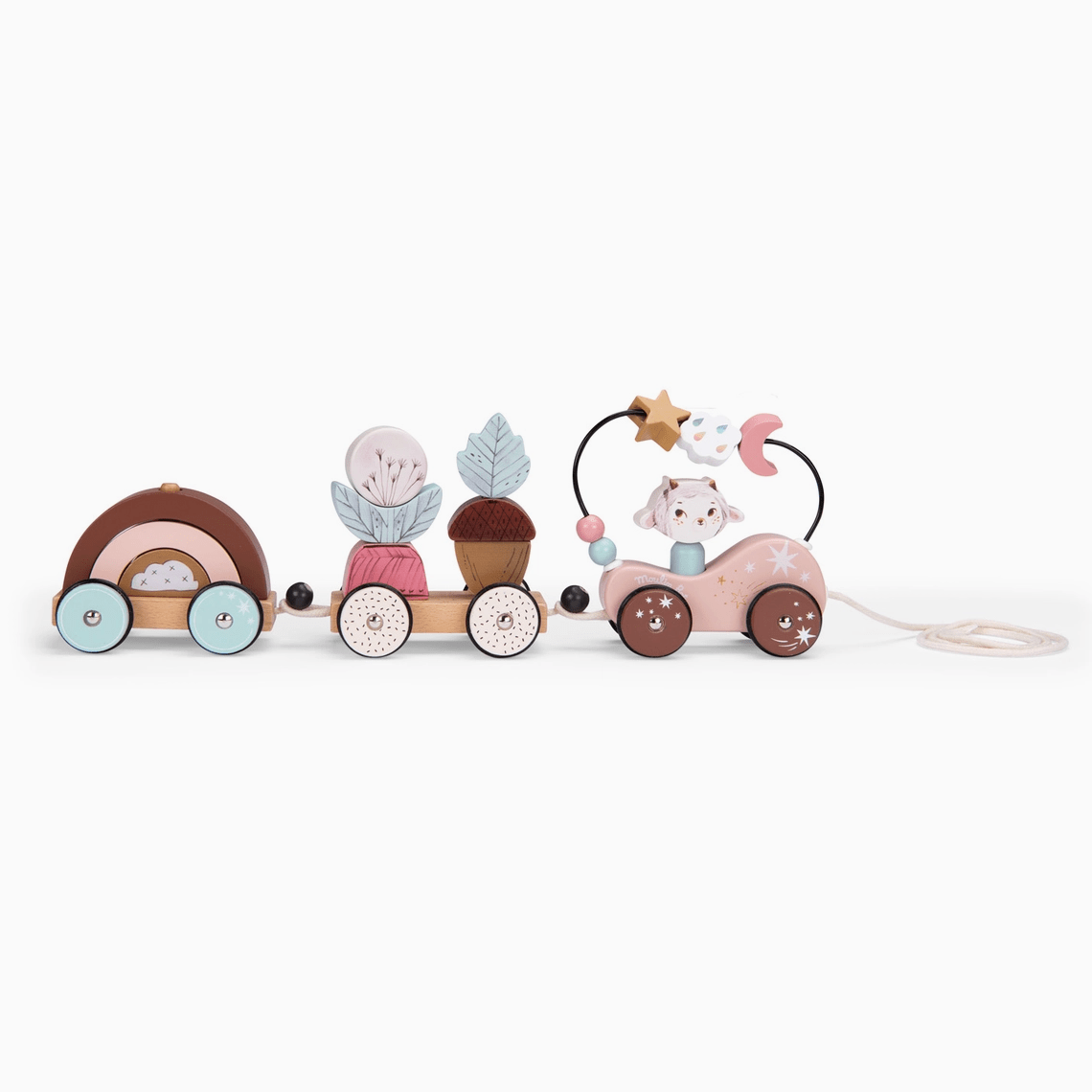 A 2-in-1 early learning toy that can be stacked or pulled along<br><br>This wooden activity train comprises 1 locomotive and 2 detachable carriages for baby to put together a rainbow, flower, etc., or create their own carriages by stacking the pieces together