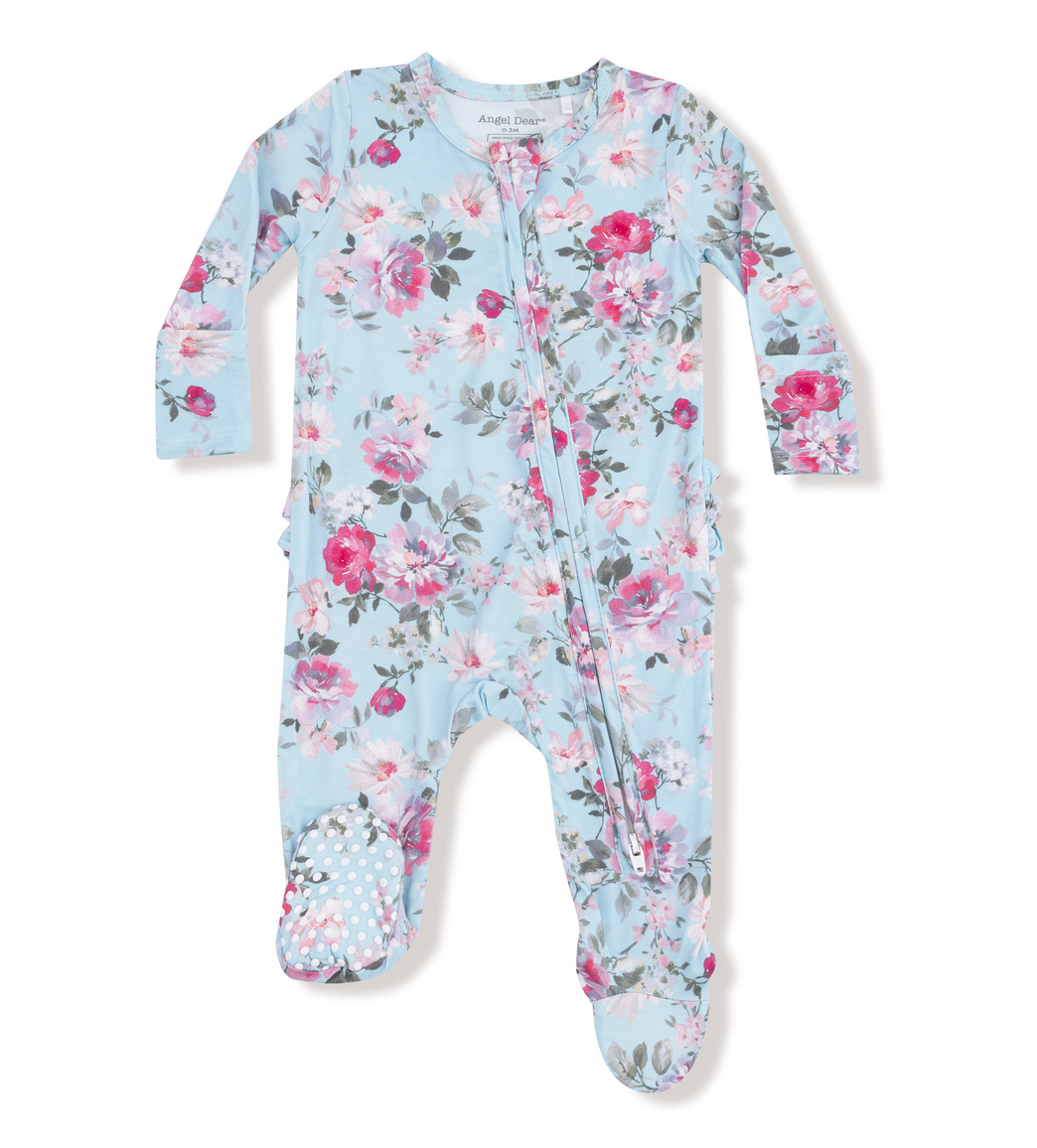 Our beloved ruffle zipper footie makes diaper changes a breeze— or better yet, a Zip! Crafted from ultra-soft bamboo fabric with Angel Dear’s charming prints, it’s sure to draw smiles everywhere. Details that delight: fold-over cuffs guard against little scratches, a lined zipper with chin guard keeps baby comfy, and fleece lining adds cozy warmth. Made of 95% bamboo viscose and 5% spandex. Machine wash gentle, tumble dry low. NB-6-9m sizes include fold-over cuffs; 9-12m sizes do not.