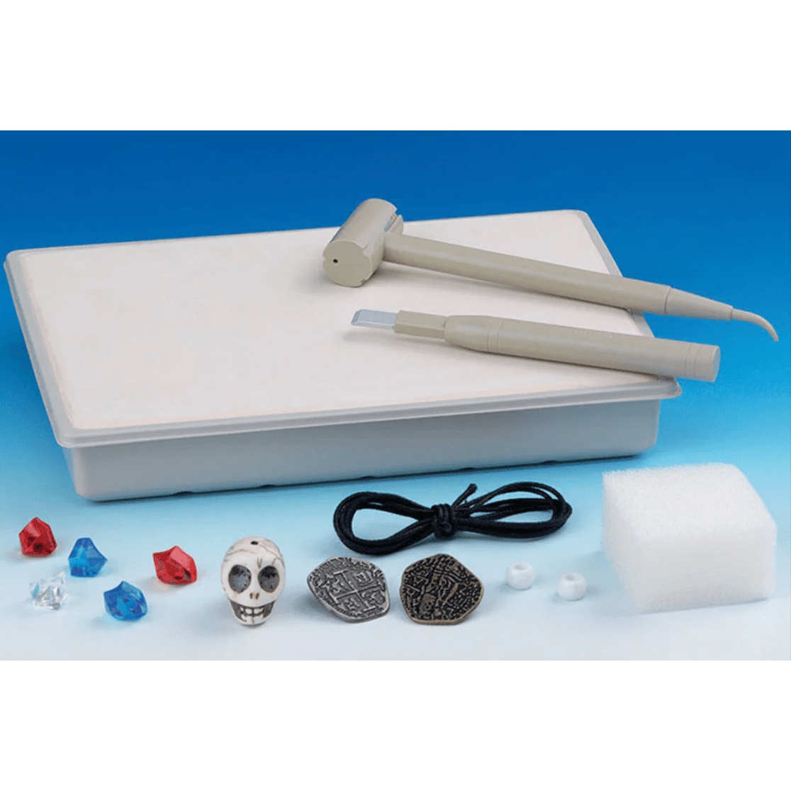 All hands on deck — there’s treasure to be found! In this pirate-themed dig-out kit, a replica pirate treasure is waiting to be excavated from a plaster block. With a hammer and chisel, you can unearth metal coins, gemstones (plastic), beads (plastic), and a large skull bead, all while learning how real archaeologists find and dig up pirate treasures buried in the ground. Learn how to tie a reef knot to fashion a pirate’s keychain for the skull and beads!