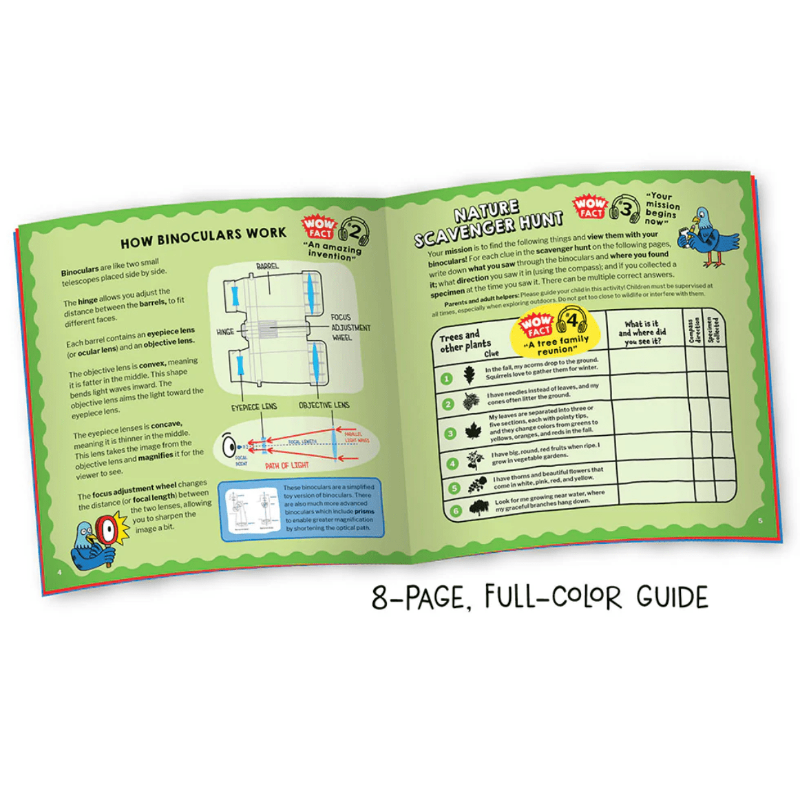 Listen to the exclusive podcast content as Wow in the World’s Guy Raz and Mindy Thomas take you on a guided expedition of the outdoors, providing you with ideas of things to look at wherever you are — the park, your backyard, your neighborhood, the city; there’s no limit to your observations with these sturdy binoculars! A fun, eight-page, full-color guide first explains how to use the binoculars and then gives you the clues for the nature scavenger hunt.