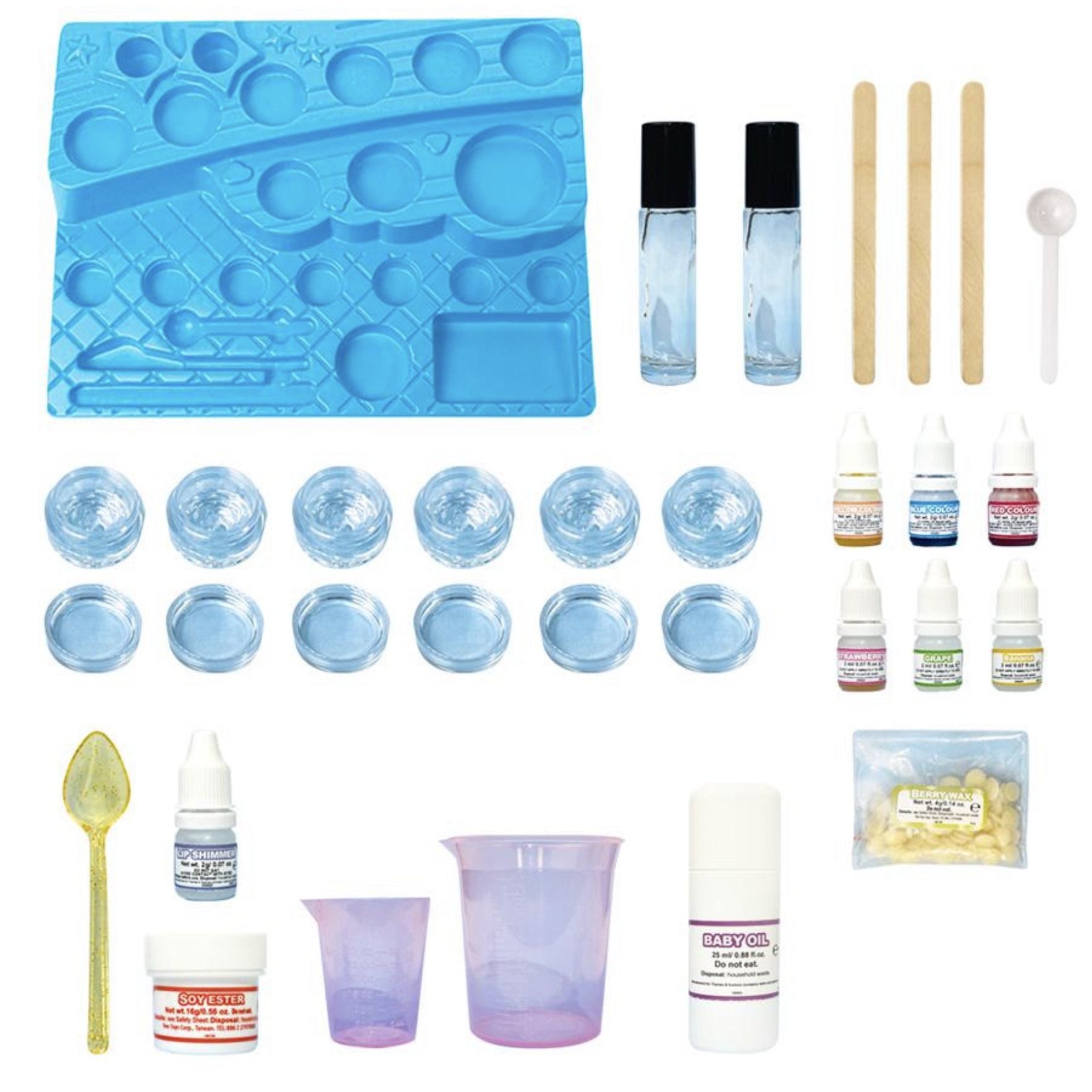 Mix up a rainbow of mouth-wateringly delicious lip balms and lip glosses. Experiment with a vibrant spectrum of colors and flavors to create your own personalized lip products. This cosmetics laboratory includes a special workstation and all the ingredients, containers, and tools you need to make up to six lip balms in clear plastic jars and two lip glosses in glass rollerball-applicator bottles. The ingredients include cosmetics-grade red, blue, and yellow dyes, which can be combined into a rainbow of colors; lip-smacking strawberry, banana, and grape flavors; shimmering fluid for the lip gloss; as well as the base oils and waxes for the balms and glosses. Decorate your workstation, jars, and bottles with the included stickers to complete your creations. Explore the biology of skin and lips and the chemistry of lip balms and glosses while learning simple lab techniques. Learn how to care for your skin and lips so they are healthy and radiant with this quick introduction to basic dermatology. A full-color manual guides you through the process of making lip balms and glosses, and provides detailed information about the science behind these products. Thoroughly tested to the highest standards for cosmetic and toy safety.