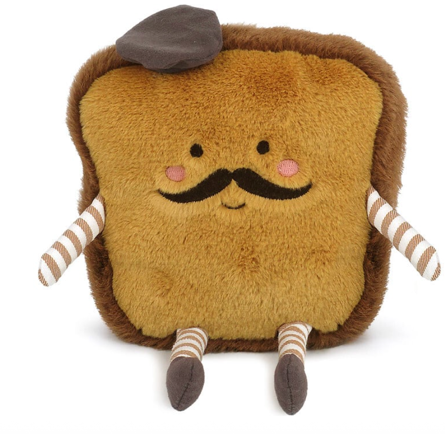 Say hello to Mon Ami’s charming Monsieur Toast plush, a quirky friend sure to win you over with its charming touches. Its soft, golden-brown exterior looks just like a slice of toast fresh from the oven, topped with a dashing little beret sitting cheekily on its fluffy head as if it’s just wandered out of a Parisian café. With sparkling eyes and a perfectly curled mustache below, this cheeky character exudes playful mischief. Complete with striped, lively arms and legs, Monsieur Toast bursts with personality and fun energy.