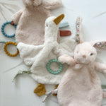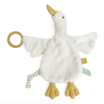 Part teether, part security blanket! Pru Goose is here to make teething a lot easier! Mon Ami' lovey plush and silicon teether toy helps baby navigate this rocky milestone like a champ. A textured, non-toxic silicon teether massages and soothes sore gums while crinkly arms keep a little one entertained with their gentle sound. Crafted of ultra-soft velour and fabric tabs, our goose lovey plush toy serves as the ideal snuggle buddy.