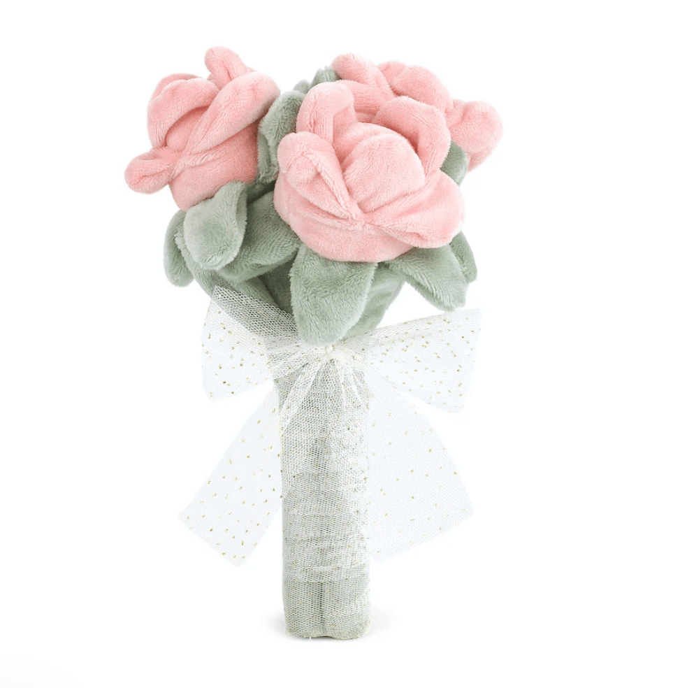 Introducing Mon Ami's elegant plush Rose Bouquet, a luxurious arrangement that captures the beauty of fresh blooms in a soft, huggable form! Each exquisite rose is crafted from plush velour, showcasing a delightful soft pink color and delicate petals that mimic the natural curves of real roses. The bouquet features three stems, beautifully wrapped together in elegant white tulle, adding a touch of sophistication and charm. The lush sage green leaves enhance the look, making this bouquet perfect for any occasion whether as a heartfelt gift or a delightful decor piece our rose bouquet is a lasting symbol of love and beauty, ready to brighten any space and warm any heart