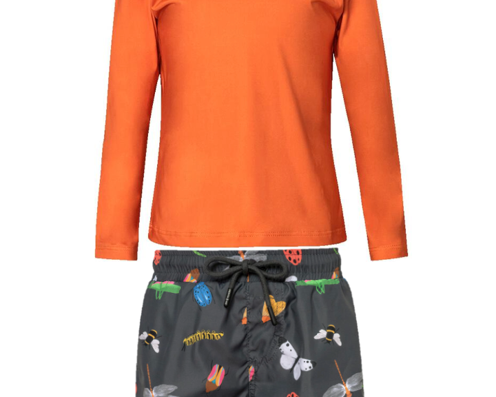Pepita & Me Orange Rashguard & Insectos Gris Swimshort Set