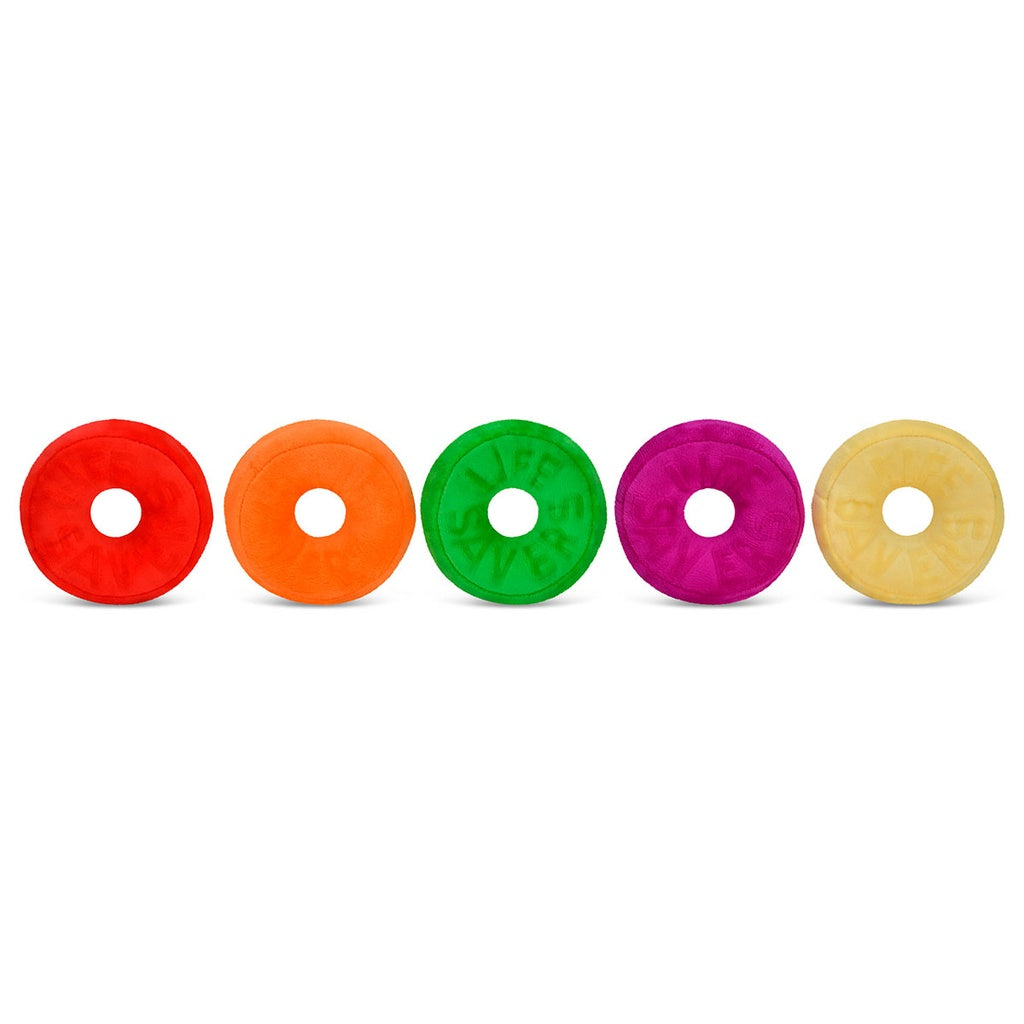 This fun package features 5 detachable candies made from ultra-soft fleece and shiny metallic fabric. Crafted with 100% polyester and filled with 100% polyfiber, it measures 14 1/2" wide by 6 1/4" high and deep. Licensed by Mars and the LIFESAVERS brand, it’s not for sale in stores targeting kids under 14.
