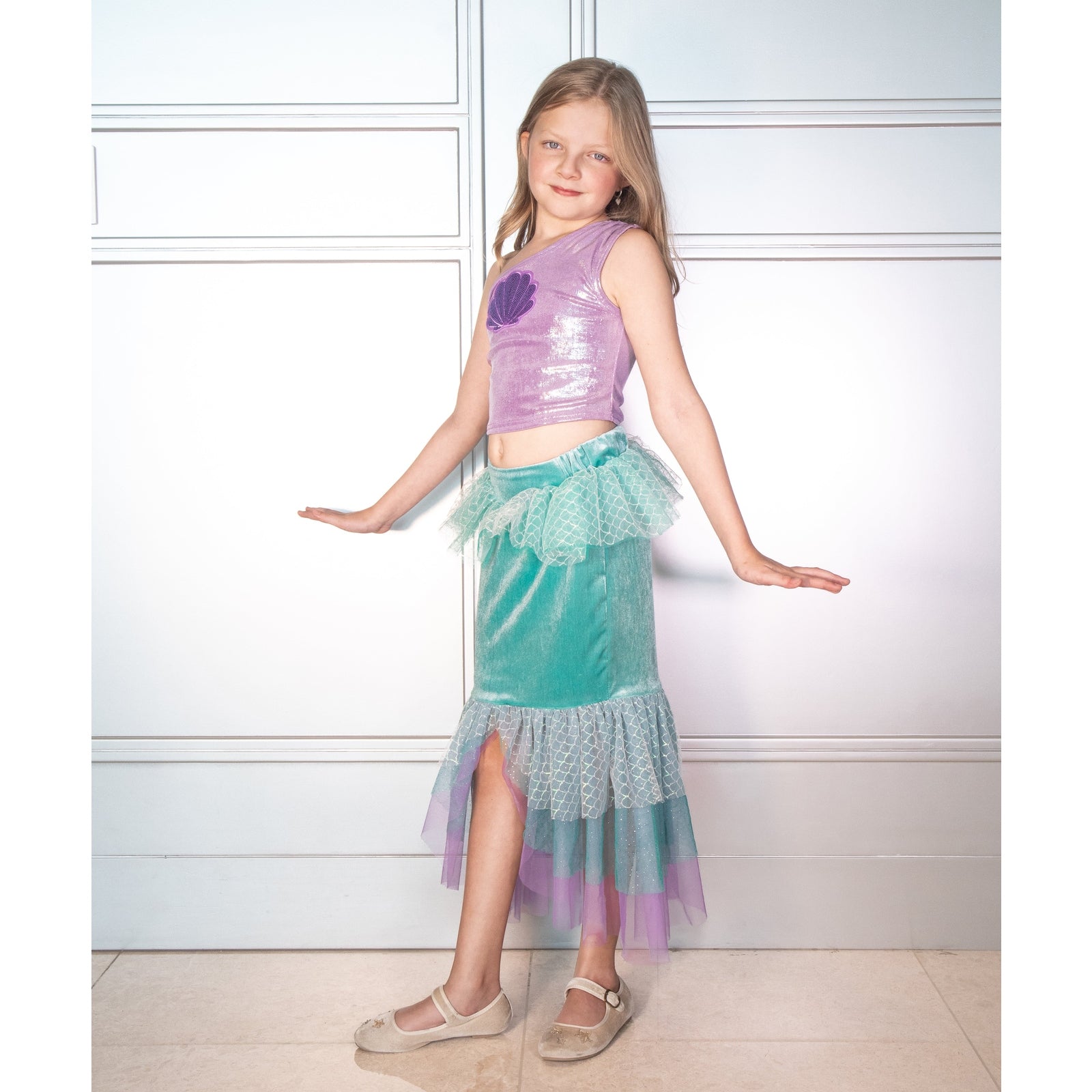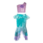 Transform your little one into a magical undersea princess with our Ariel-inspired two-piece costume! The shimmering purple, one-shoulder cropped top is soft and lined for comfort, featuring a sparkling sequin seashell at the center. The turquoise skirt simulates a mermaid tail and it's made from our signature soft, stretchy velvet. This bottom offers an elastic waistband and is lined for easy wear, while the tulle fins shimmer with white and silver scales layered with purple and green tulle, creating a mesmerizing, aquatic effect. Perfect for parties or dress-up, this costume ensures your mermaid shines above and below the ssea!