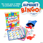 njoy a game that teaches the alphabet! This twist on classic Bingo helps kids learn and practice letter names and sounds. Reach into the bag and pull out a letter token—if you have a match, you're on your way to a bingo! It’s easy to play, with six boards so friends and family can join the fun.• Early-learning bingo game for practicing school lessons at home• Develop letter recognition, plus vocabulary and language skills• Instructions include eight game variations to try!• Perfect for home or classroom use• Includes 6 game boards, 26 alphabet tokens, 72 chips, 1 game bag and inst