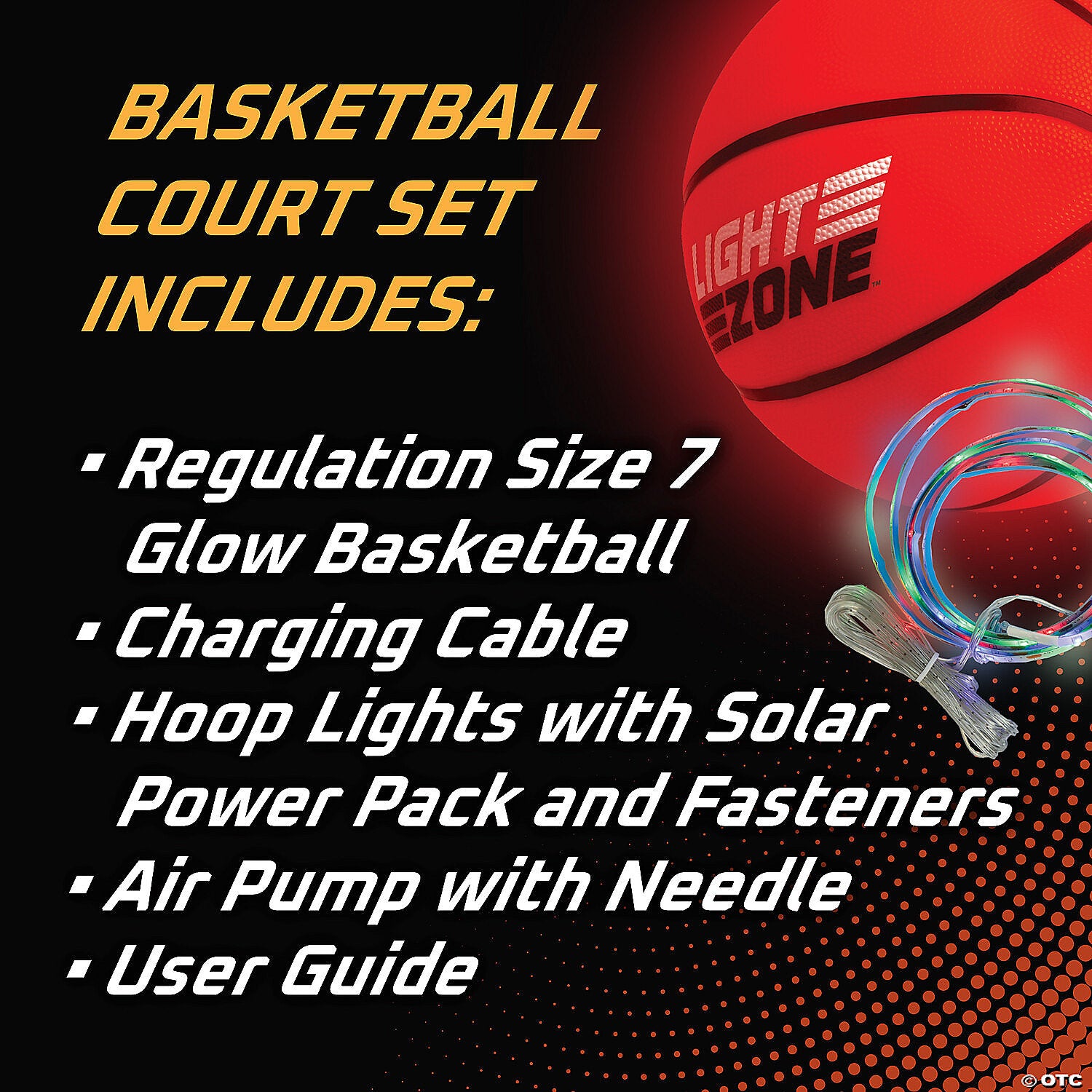 • This Glow Basketball Court Set lights up your basketball court with a glow-in-the-dark basketball with 3 hours of glow power and waterproof LED hoop lights