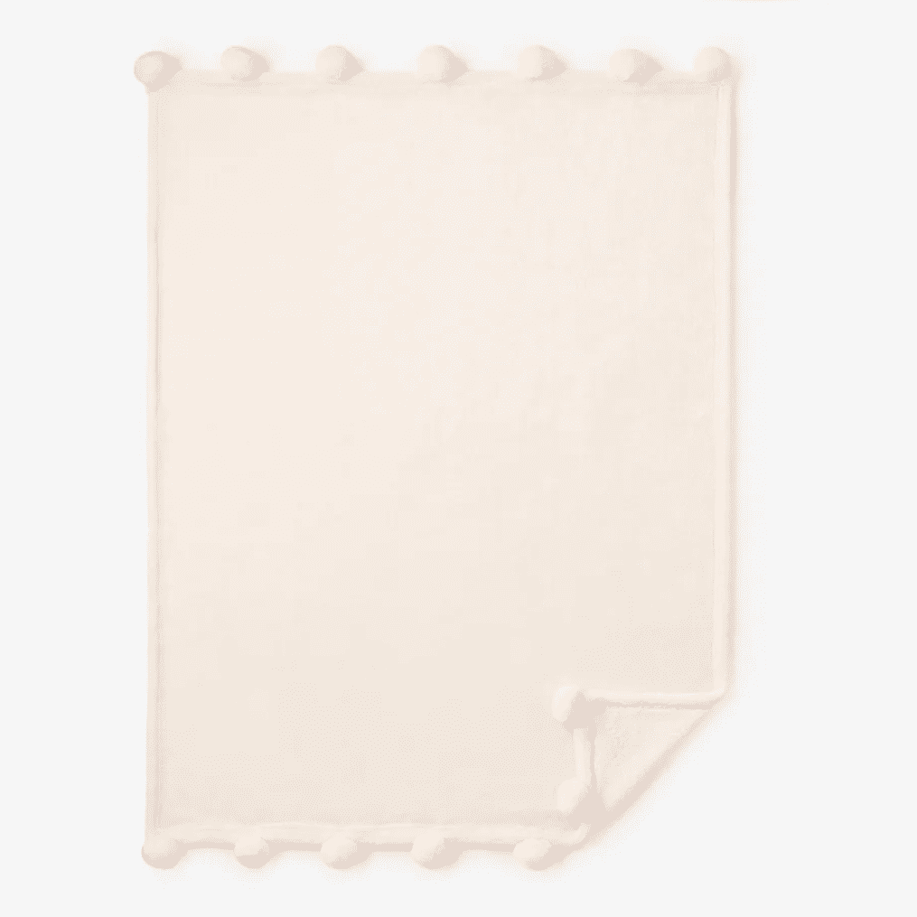 Our Pom Trim Fleece Baby Stroller Blanket is as warm and snuggly as it is durable, sure to become baby's favorite blanket. Lovingly made with mid-weight 100% soft polyester fleece, our cream-colored stroller baby blanket has adorable pom poms lining its end edges and is delivered folded and tied with a ribbon for easy gifting. It's machine washable and durable, yet will stay soft for years to come.