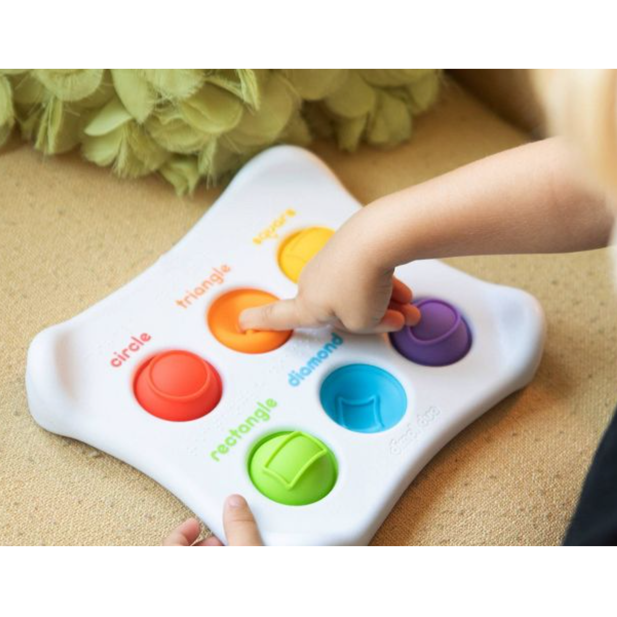On one side, each silicone button is embossed with a different shape and labeled with its matching word in English and in Braille. Flip the whole thing over and this time, the buttons are smooth and the words match the colors!