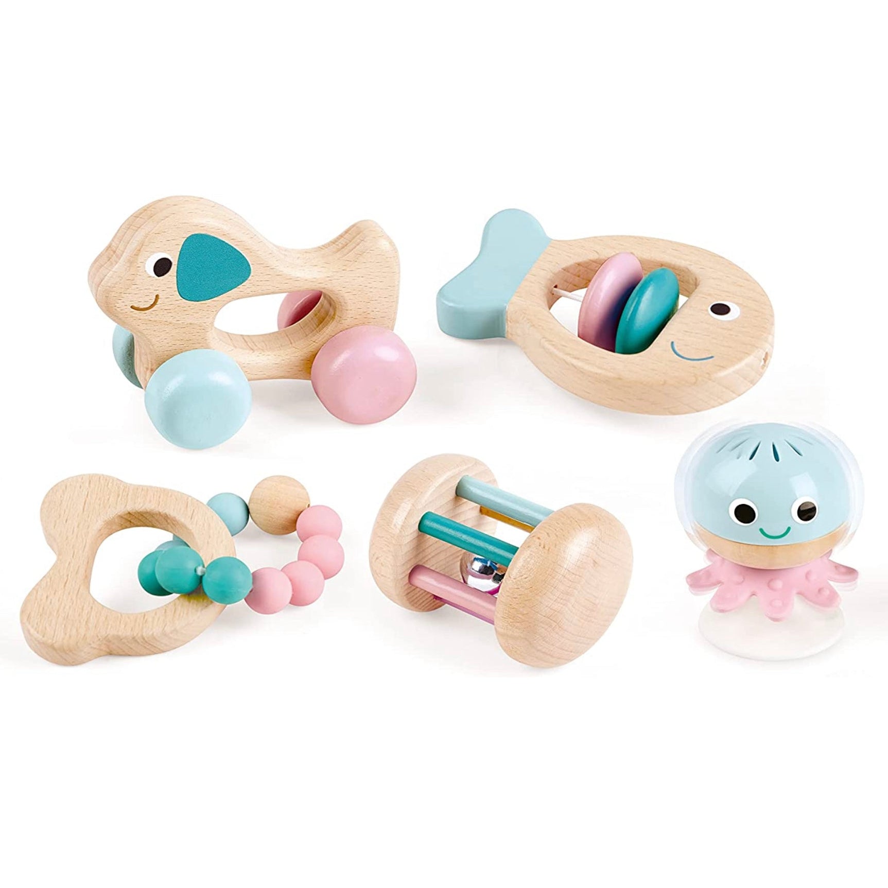 - . Baby to Toddler Sensory Gift Set: Includes one fish rattle, one beads teether, one stay put rattle, one rolling rattle and one dog on wheels. Specifically designed for babies to toddler which is full of activities and tips to help them reach developmental milestones.
