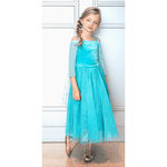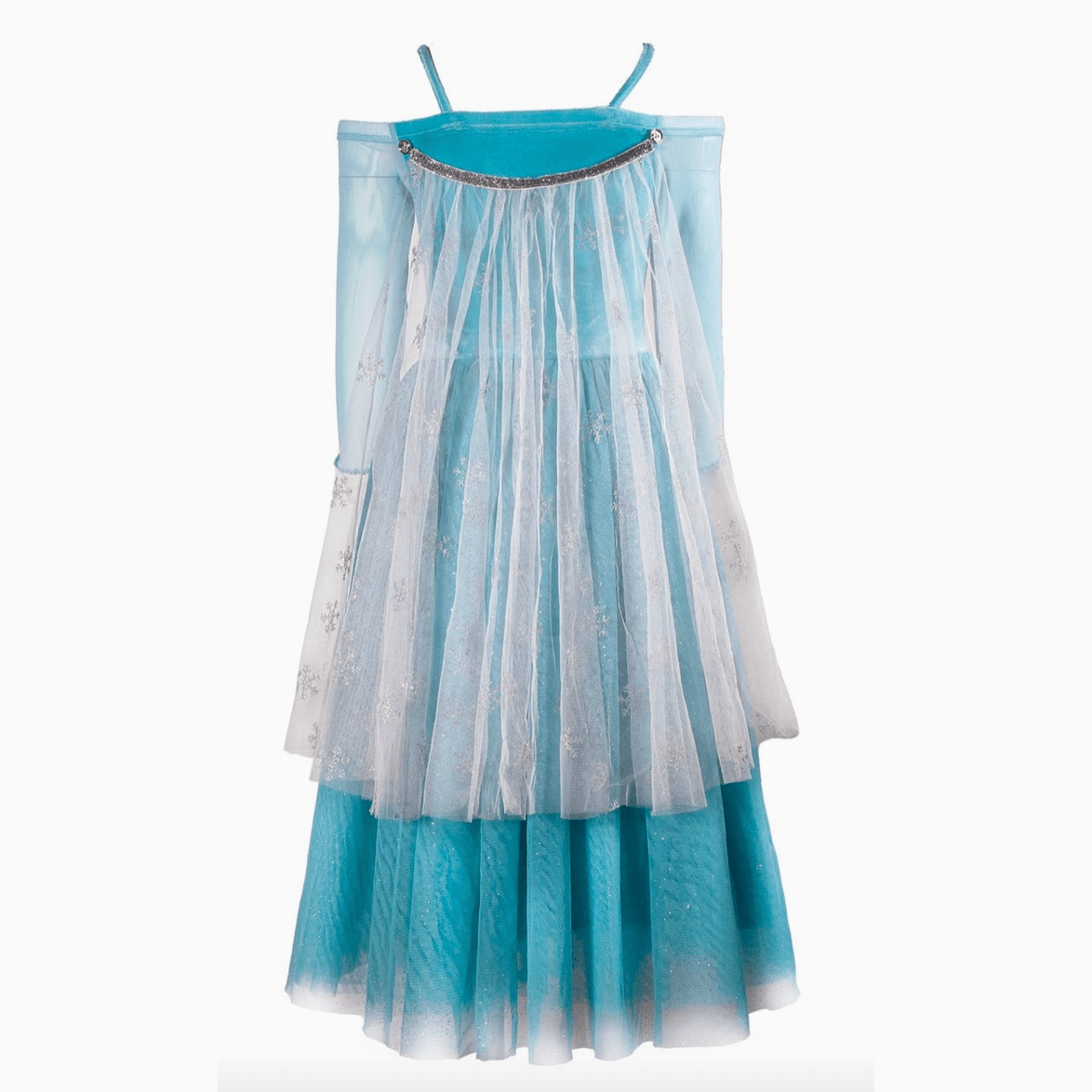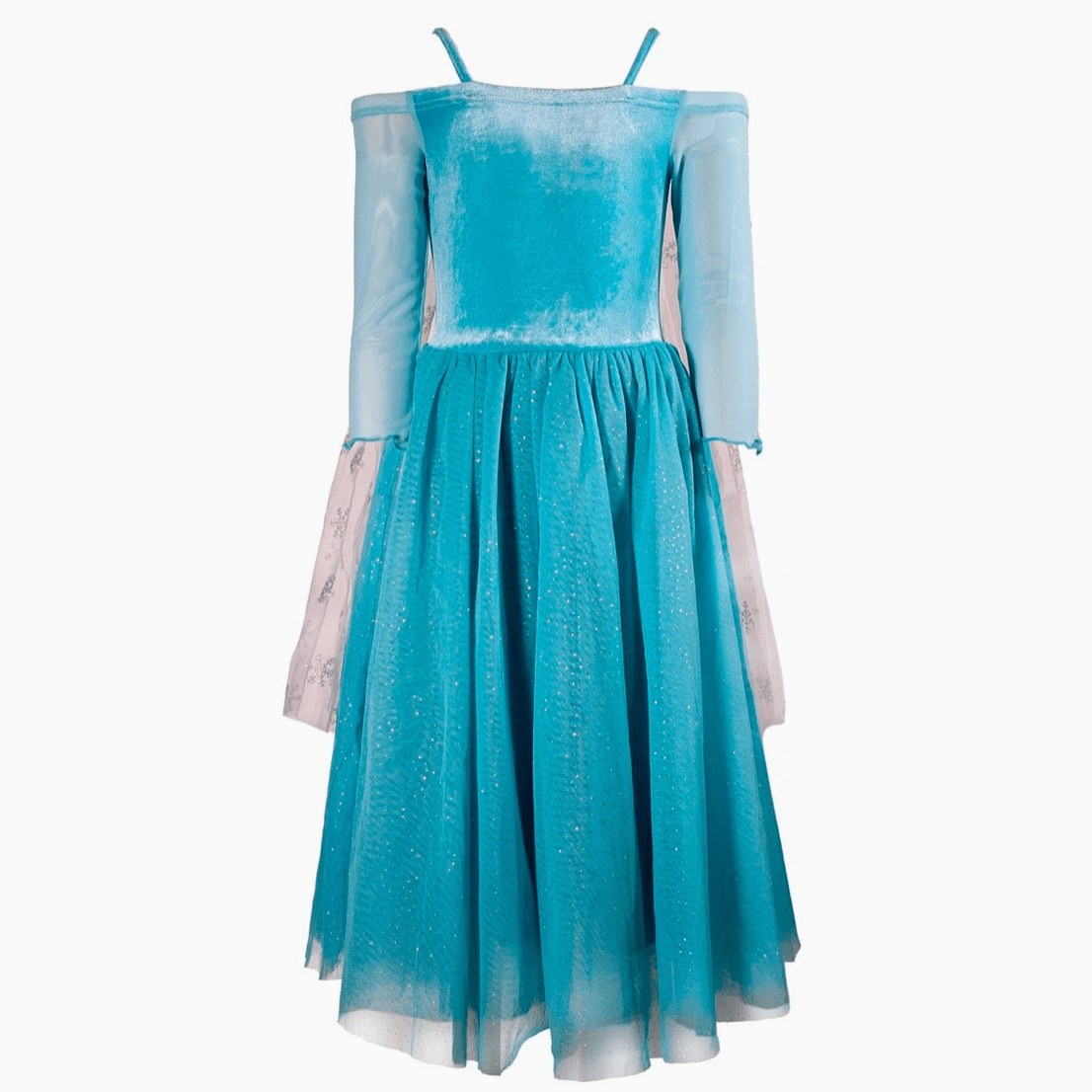 No glitter mess! - Machine washable in gentle cycle, tumble dry low or medium heat. We recommend that the cape be hand washed. - Material: 100% polyester - Skirt lining: 100% cotton - Slim fit, size up for a looser fit Our super soft outfit is perfect as a gift, it's non itchy and deserves to be worn year round for cosplay, imagination play and even as pajama. The character Elsa is one of the strongest female role models in our children's generation, so it was only natural for us to want to bring her transformation dress to life. This dreamy, elegant dress has our signature soft stretchy velvet top, and delicate 3/4 length mesh sleeves. The dress also features a full tulle skirt in sparkly turquoise, lined with a cotton underskirt and a magical silver snowflake printed tulle cape (removable).
