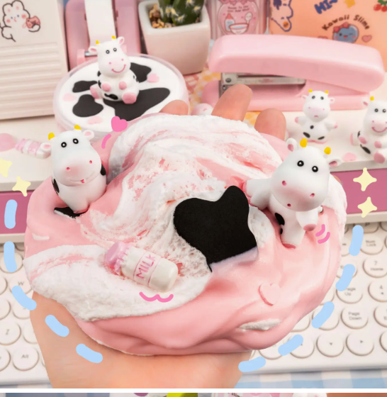 Straw-Dairy Cow may be one of the cutest Slimes we have ever created! She is perfect in every way, from her glossy mirror like base to the carefully crafted clay topper and her heavenly sweet strawberry milk scent. Once combined it turns into a poofy, chewy butter Slime that is so addicting to play with. Light and airy and so fun to inflate over and over.