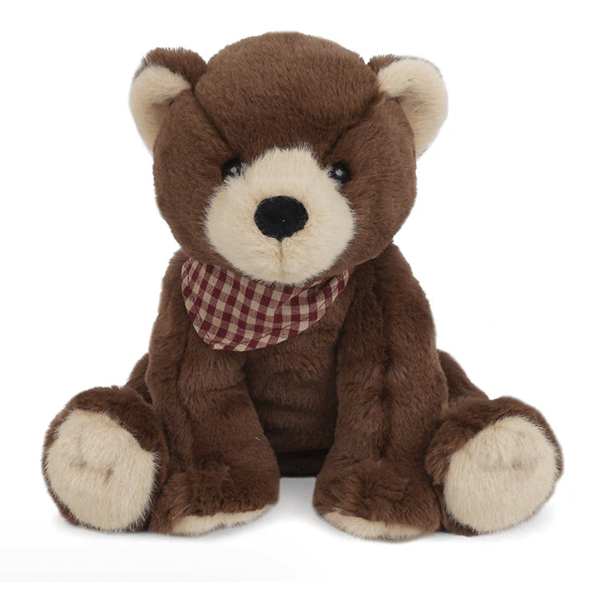 Fudge the Brown Bear is ready to snuggle. Unique and irresistable with cranberry gingham bandana.