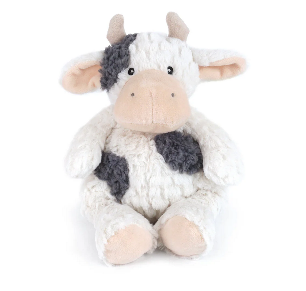 Introducing Patches, your new barnyard bestie with personality to spare! This adorable plush cow features a cream-colored textured coat, soft pink snout, and charmingly uneven dark patches that give her loads of character. With floppy ears, a huggable plush body, and an irresistibly sweet expression, Patches is ready for endless cuddles and adventures. Made entirely from recycled polyester, she's a gentle choice for the planet while being gentle on little hands. Her embroidered details add extra charm, and at 11 inches tall, she's the perfect size for snuggling, playing, or gifting. Spot clean and air dry. Safe for all ages and tested to exceed safety standards.