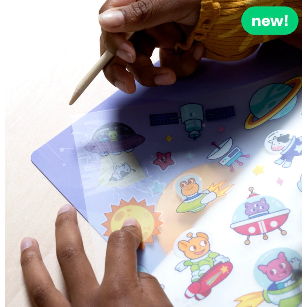 This Set The Scene sticker kit is for those of us who dream of blasting off into worlds unknown! It features a wooden transfer tool, a double-sided space-themed playboard, and a whole host of galaxy stickers (aliens included!). So fasten your jet pack onto your imagination because your creativity will know no bounds.