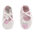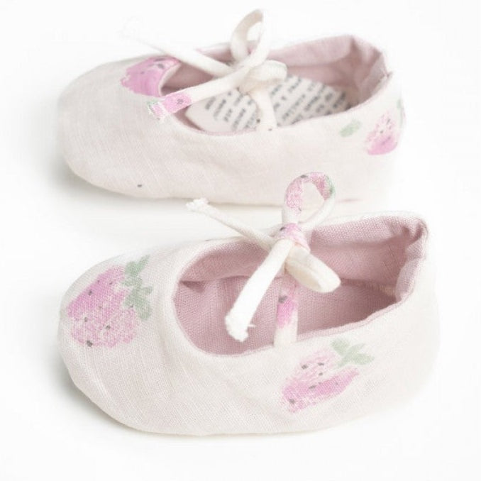 These ballet flats are made from fabric with a blend of linen and organic cotton. They feature a ballet design, bows on the upper part, an embroidered strawberry pattern on the front, adjustable ribbons, and coconut buttons.