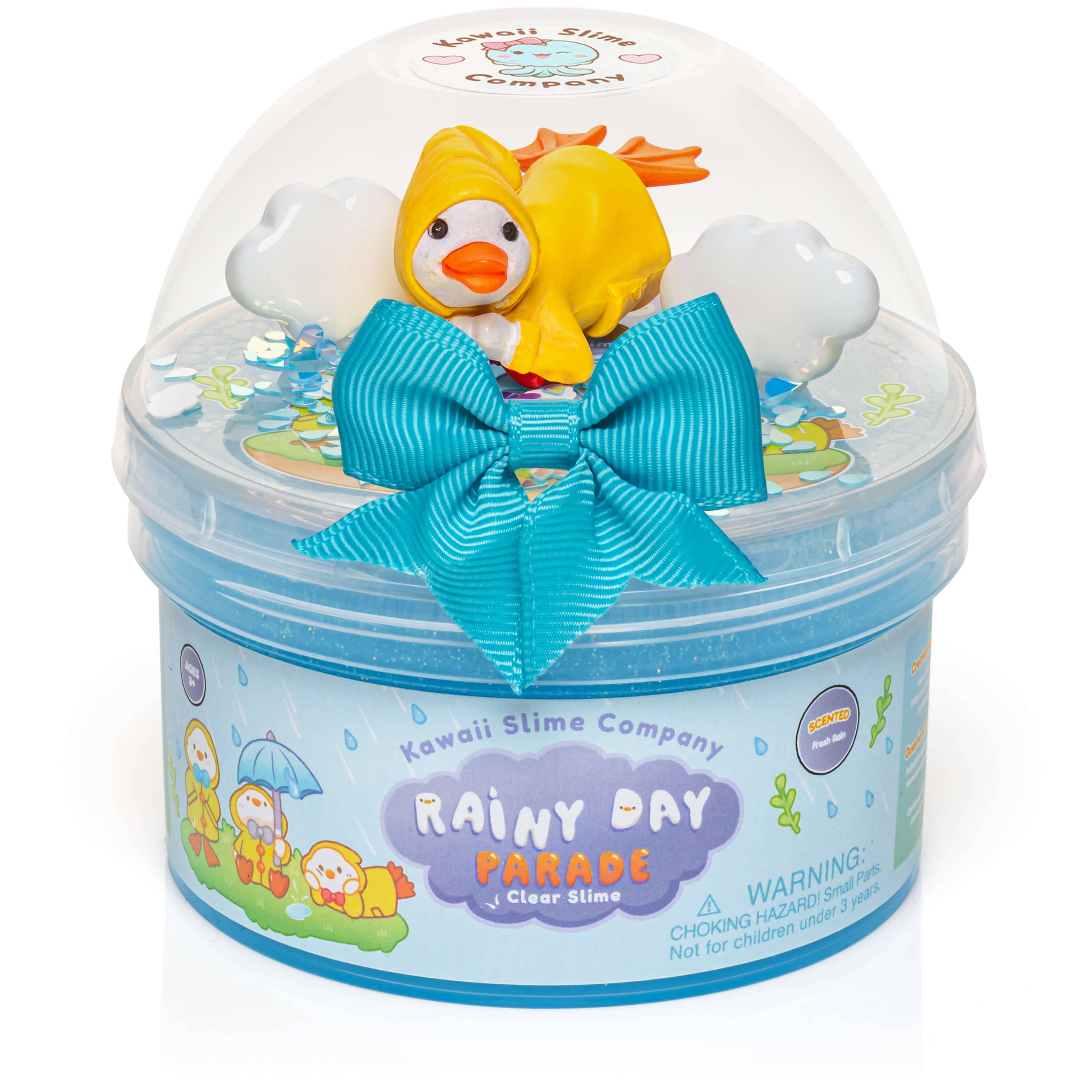 Dive into sensory delight with our glittery blue clear slime that sparkles like a rainy day sky! Each container comes with an adorable duck charm wearing a trenchcoat and iridescent rain and cloud confetti. Perfect for stretching, poking, and making satisfying bubble pops. Experience the refreshing rain scent while enjoying hours of tactile fun!