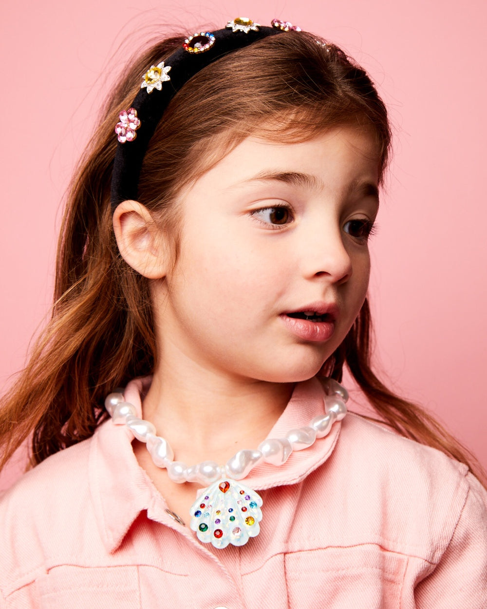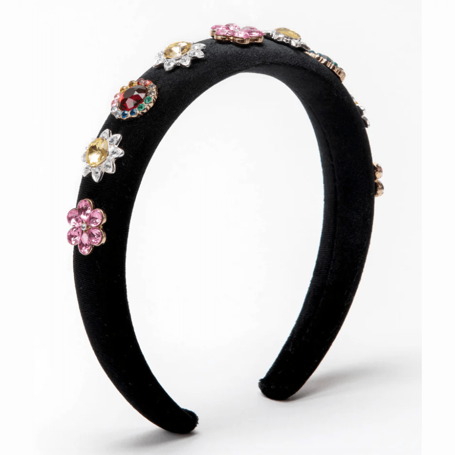 Snag your front row seat (or front yard porch chair!) and smile in style! This extra padded, black velvet headband is as comfy as it is stylish. Oversized floral gemstones in vibrant colors give a high-fashion pop to any outfit. Perfect for people-watching, trend-spotting, and catching the eye of allll the street-style photogs.