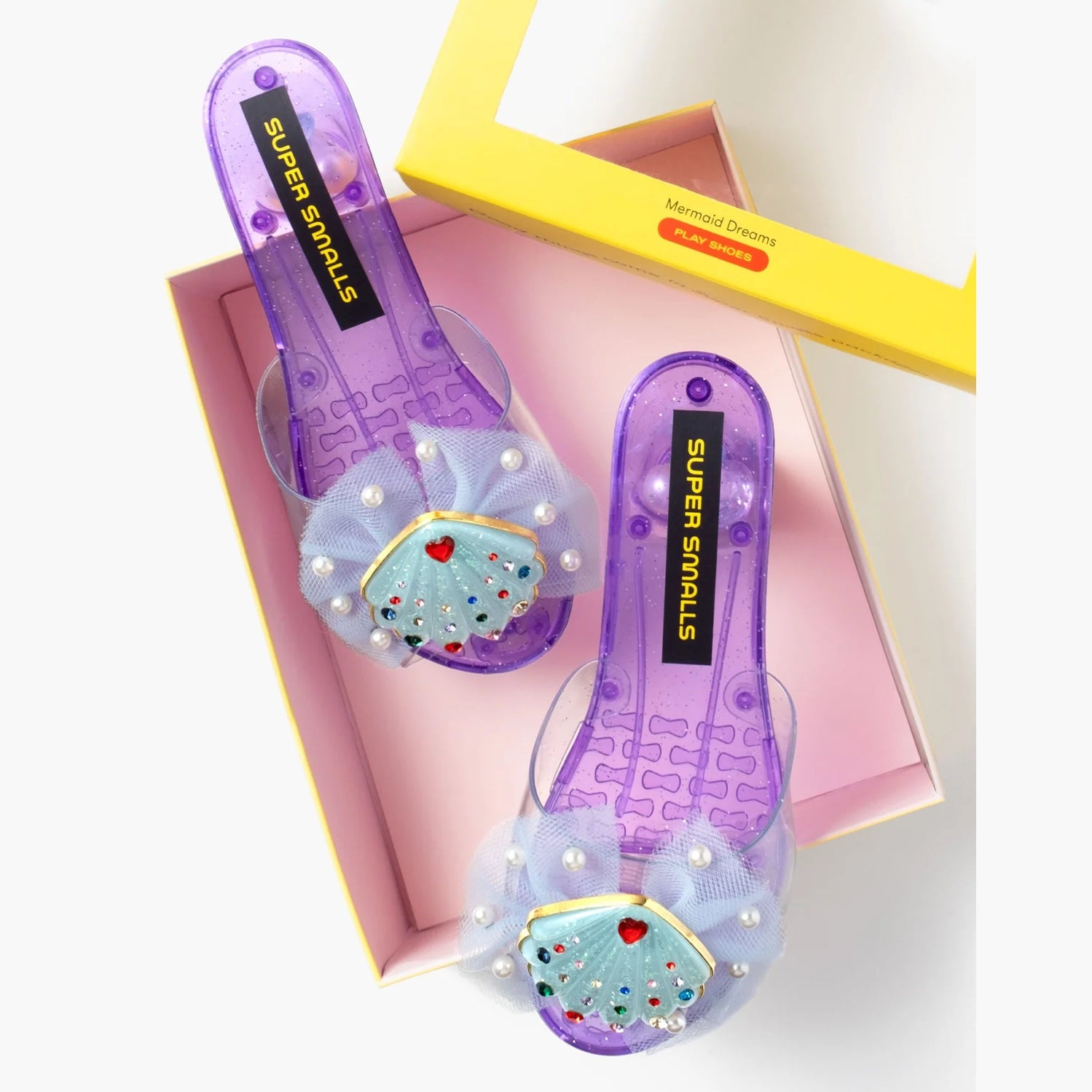 - Sparkling purple play heels feature oversized gem-covered seashell jewel and tulle accents